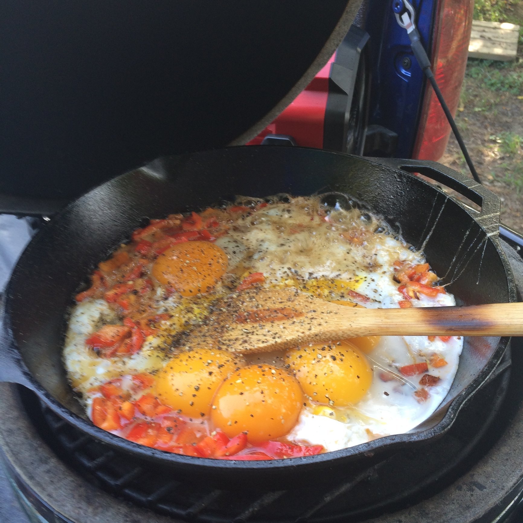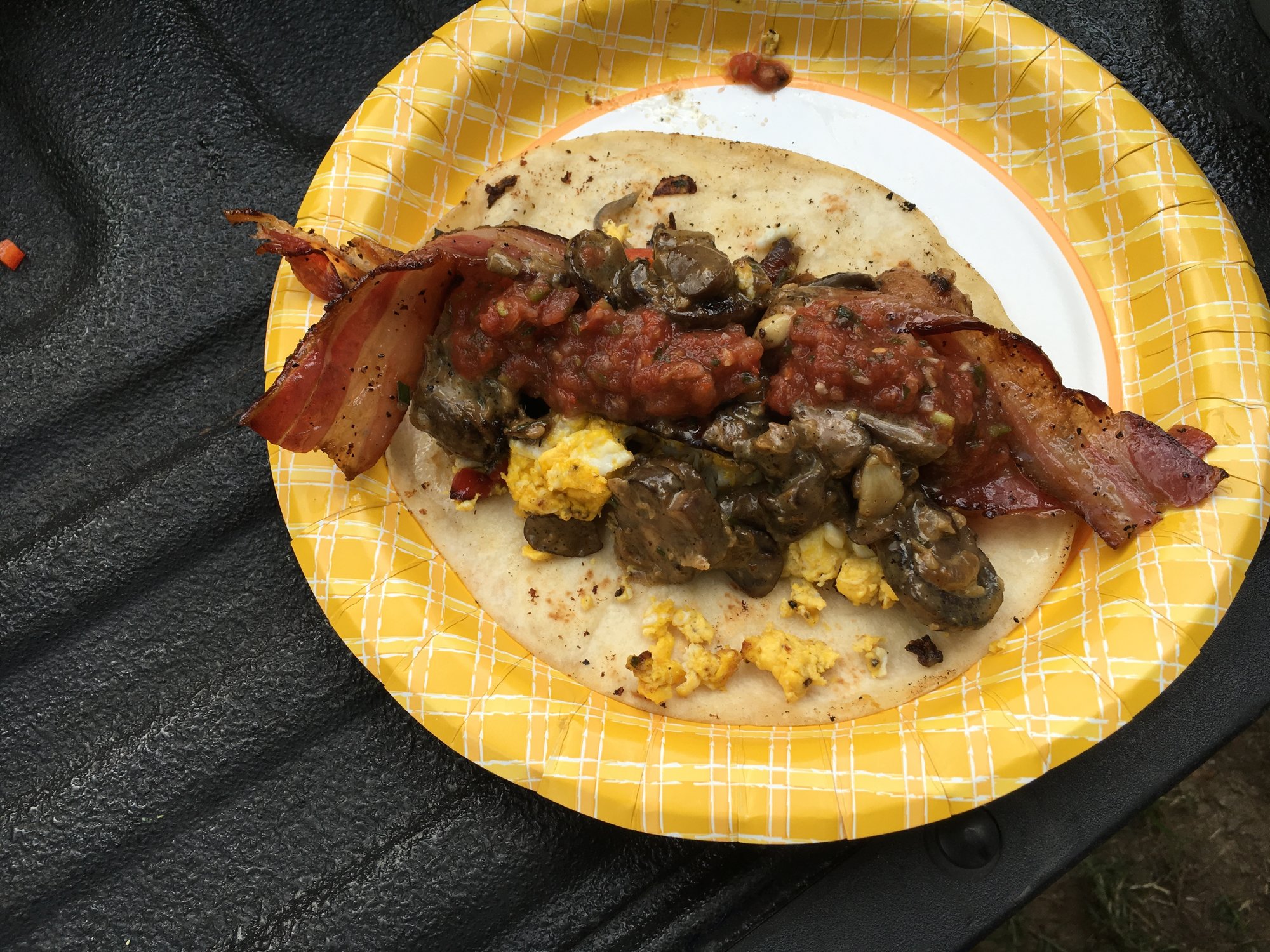 First was was fresh farm raised duck egg, homemade Berkie bacon, skillet fried potatoes and mushroom breakfast tacos made on @20stone minimax (with a bacon assist from @Foghorn trash can cooker. These were eaten standing up on paper plates from the bed of a pickup after staying up way too late, drinking way too many rare beers, and sleeping 6 dudes in a trailer made for a family of 4. No showers or toothbrushes were harmed in the filming of this scene.