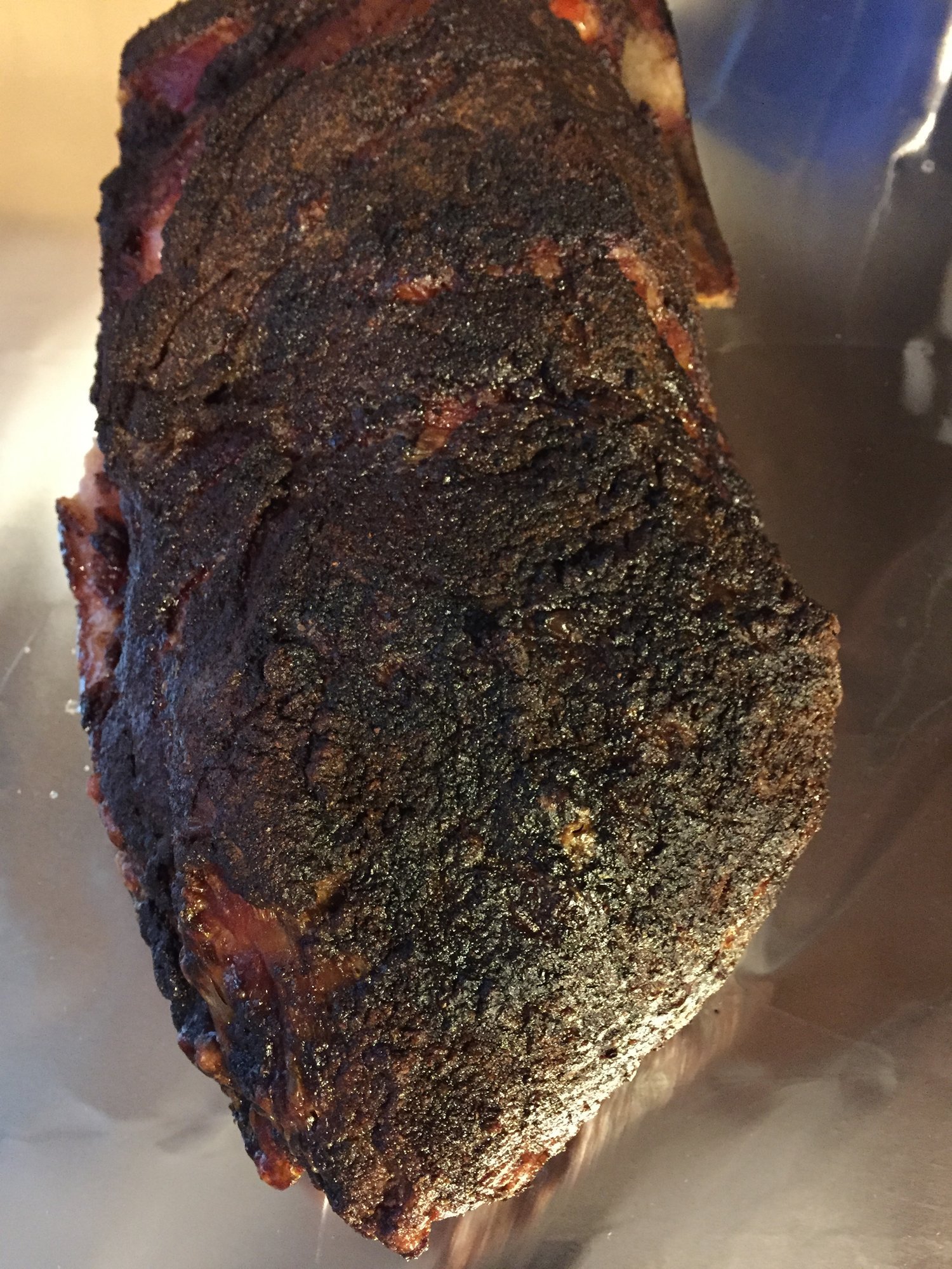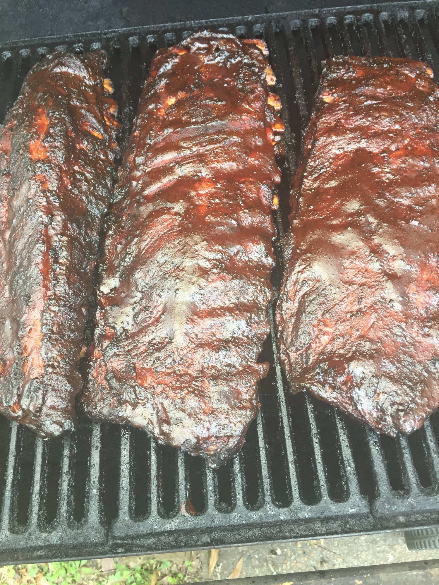 We did baby back ribs. I mixed up a batch of Meathead's Memphis Dust, and we mostly followed the directions for Competition Pork Ribs from Smoke It Like A Pro by Eric C. Mitchell. We didn't have apple cider, so we used some Coke. And when we pulled them I sneaked a little off a corner and my husband decided he didn't want to sauce them. Instead we had sauce on the table. They were good with & without sauce.