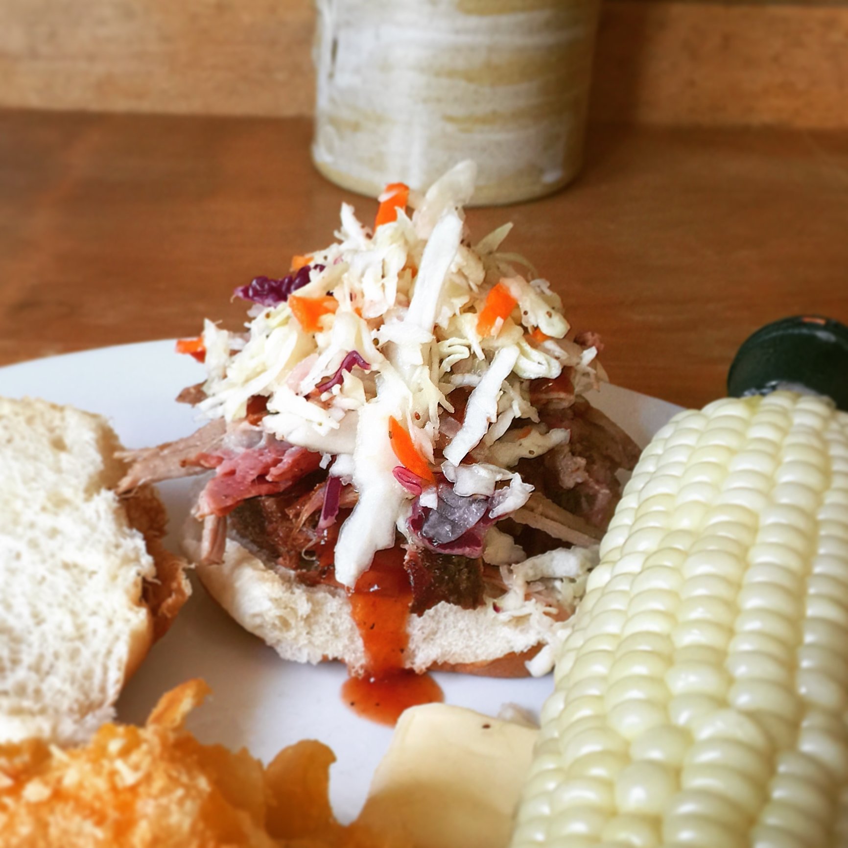 Just good ole fashioned pulled pork BBQ sammiches with fresh, local corn on the cob and Mac n Cheese. Oh, and also a rum punch to help cope with the heat outside.