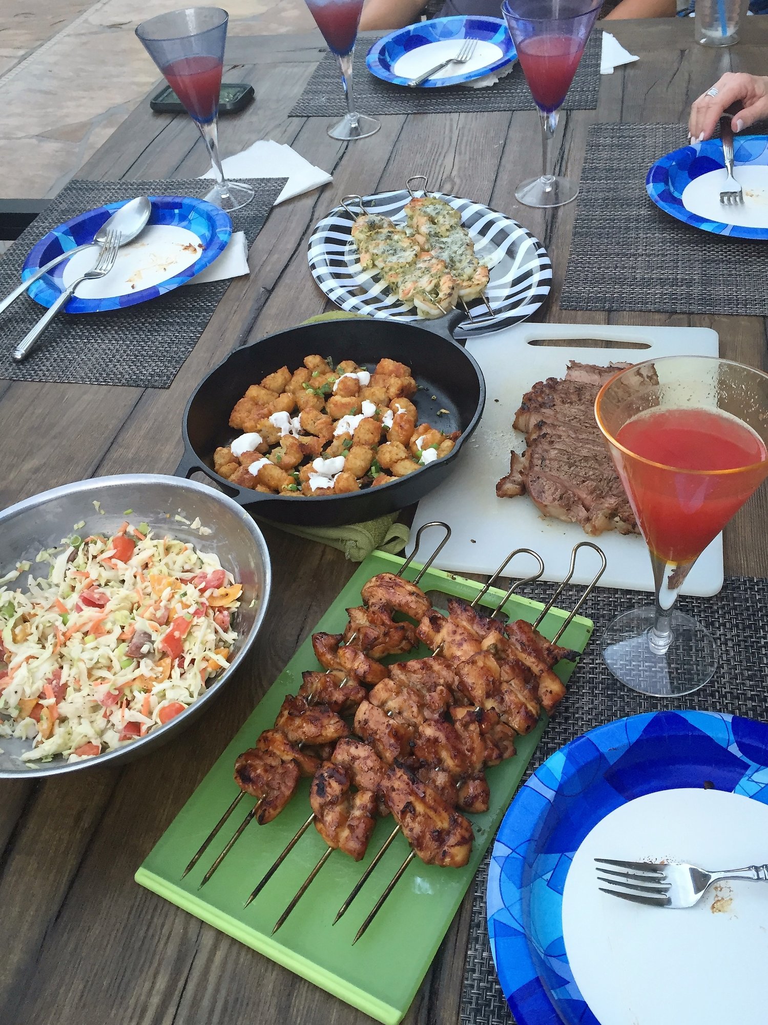 Sorry about the forks but we just finished stuffed mushrooms followed by Green Lightning Shrimp, Honey Glazed Stout Thighs, Strip Steak, Cole Slaw and Tater Tots....chased with a Watermelon Rita.