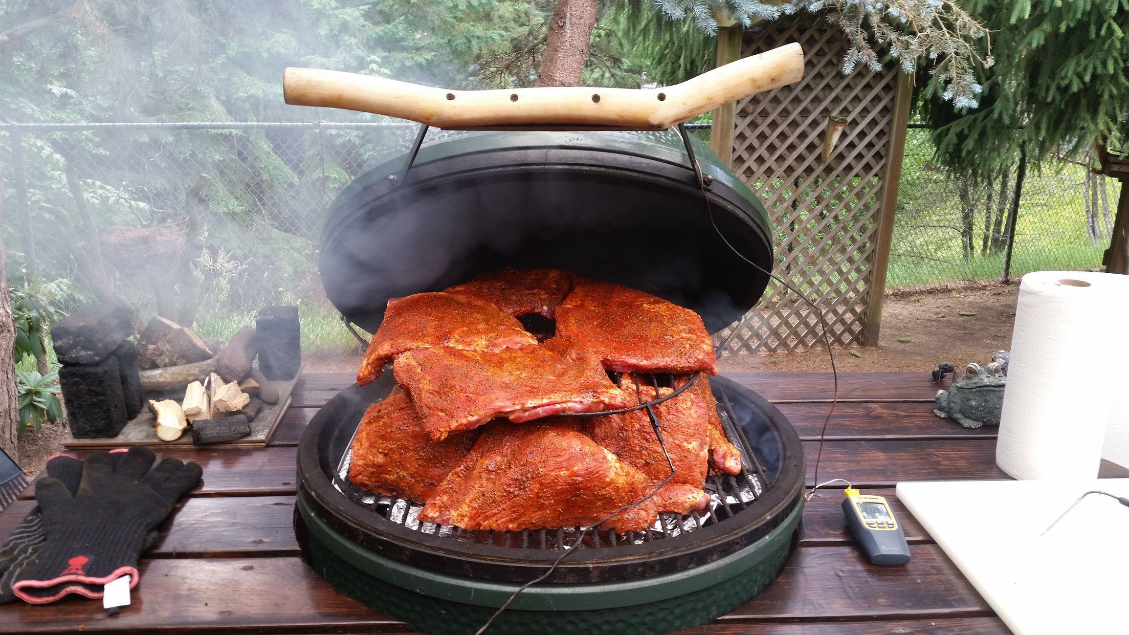 225 for the first 3 hrs at that point I'll make a decision wether to wrap in tin foil for a while then finish them or ramp up temp don't wrap them apply some special sauce and let them finish themselves bareback. What do you think? and I'm having 30 people here at 5 would like to eat around 6:30.Comments