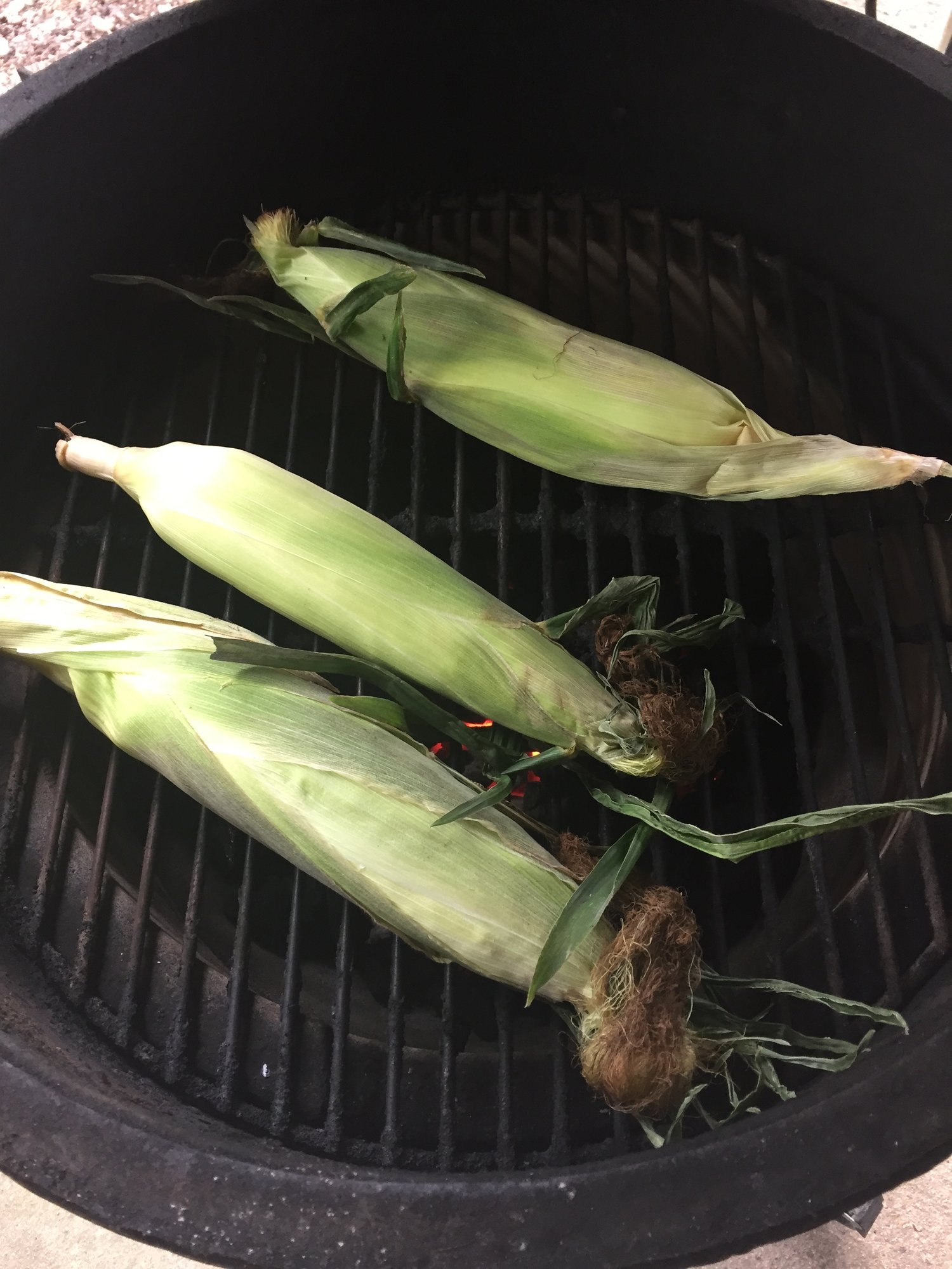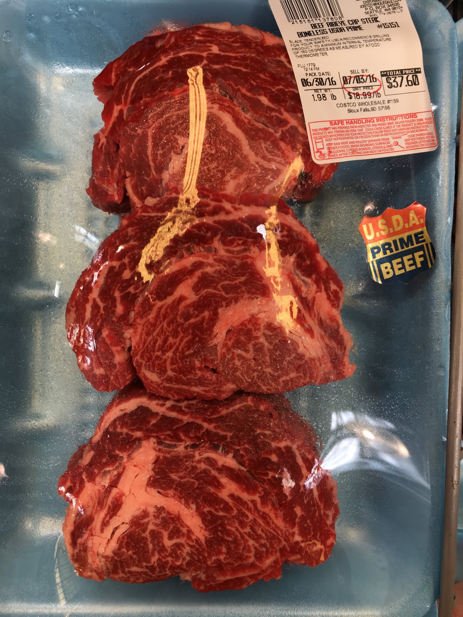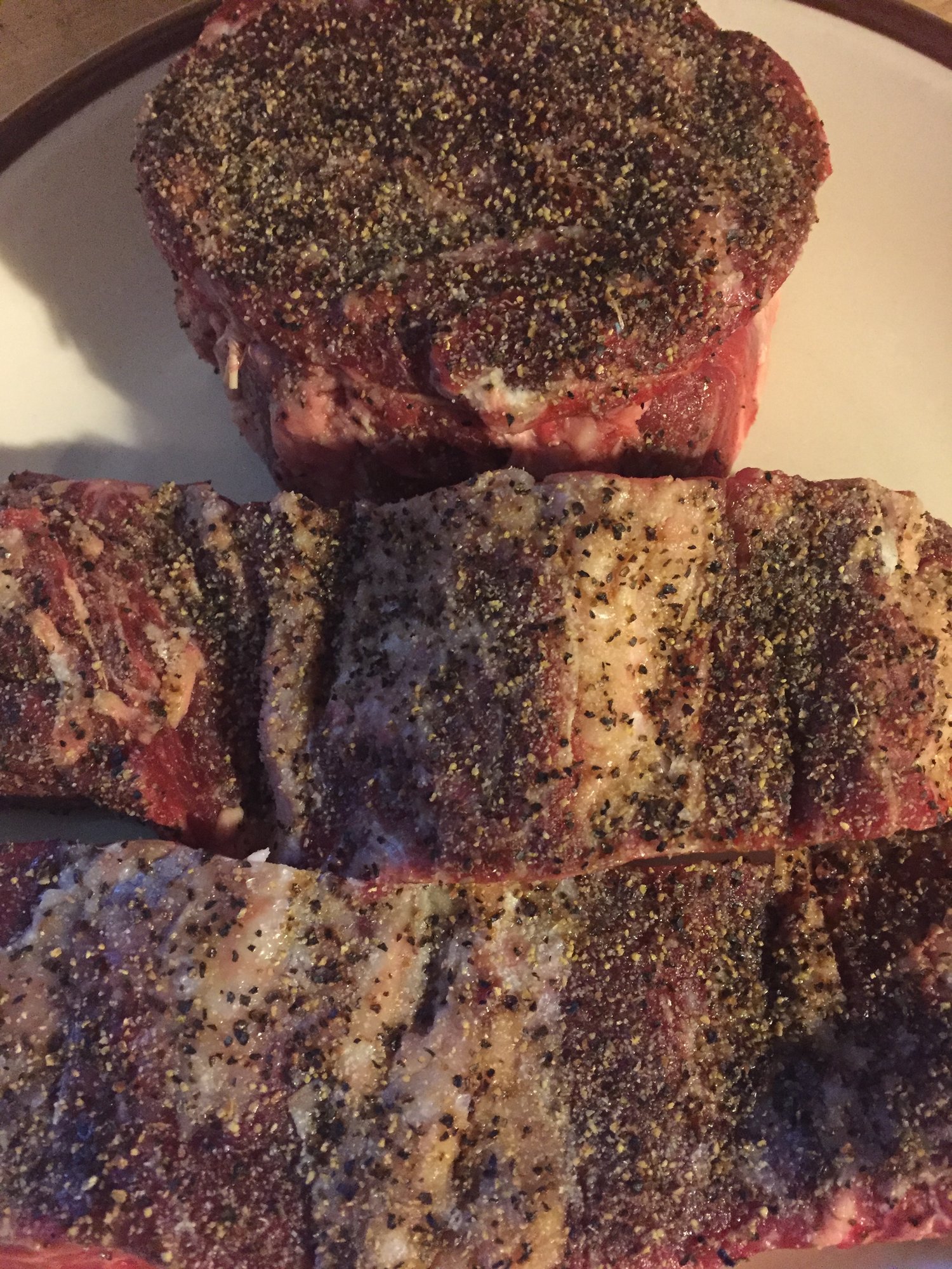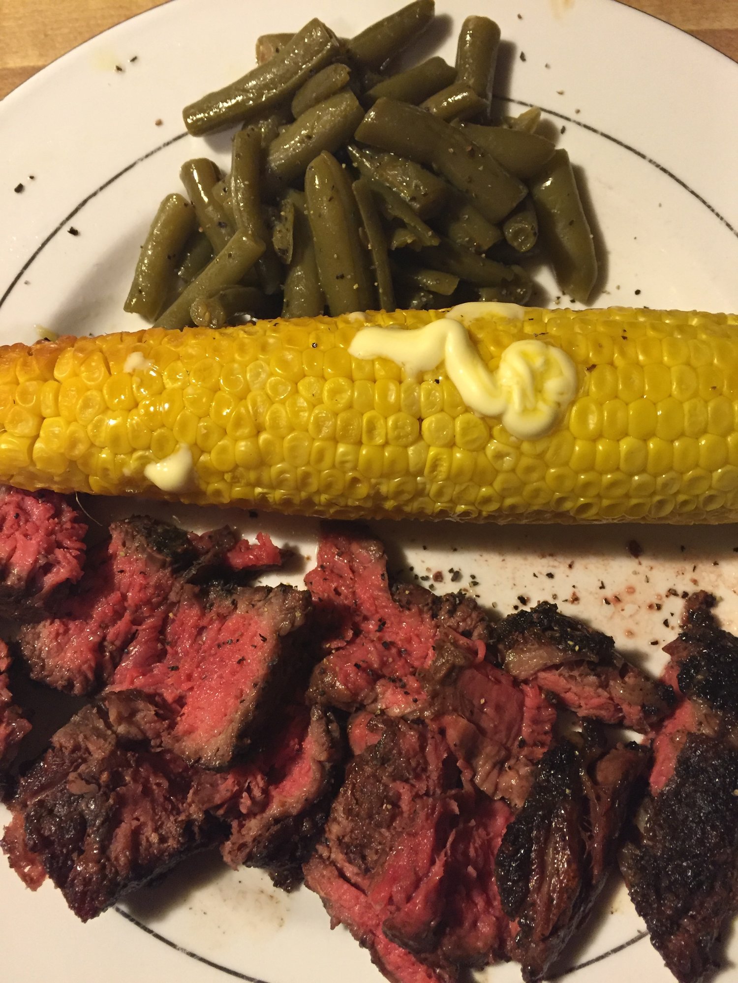 Fresh corn and my first go at the ribeye cap steak from Costco. One rolled and one un-rolled. Coarse S&P, garlic powder, and a little black magic..: