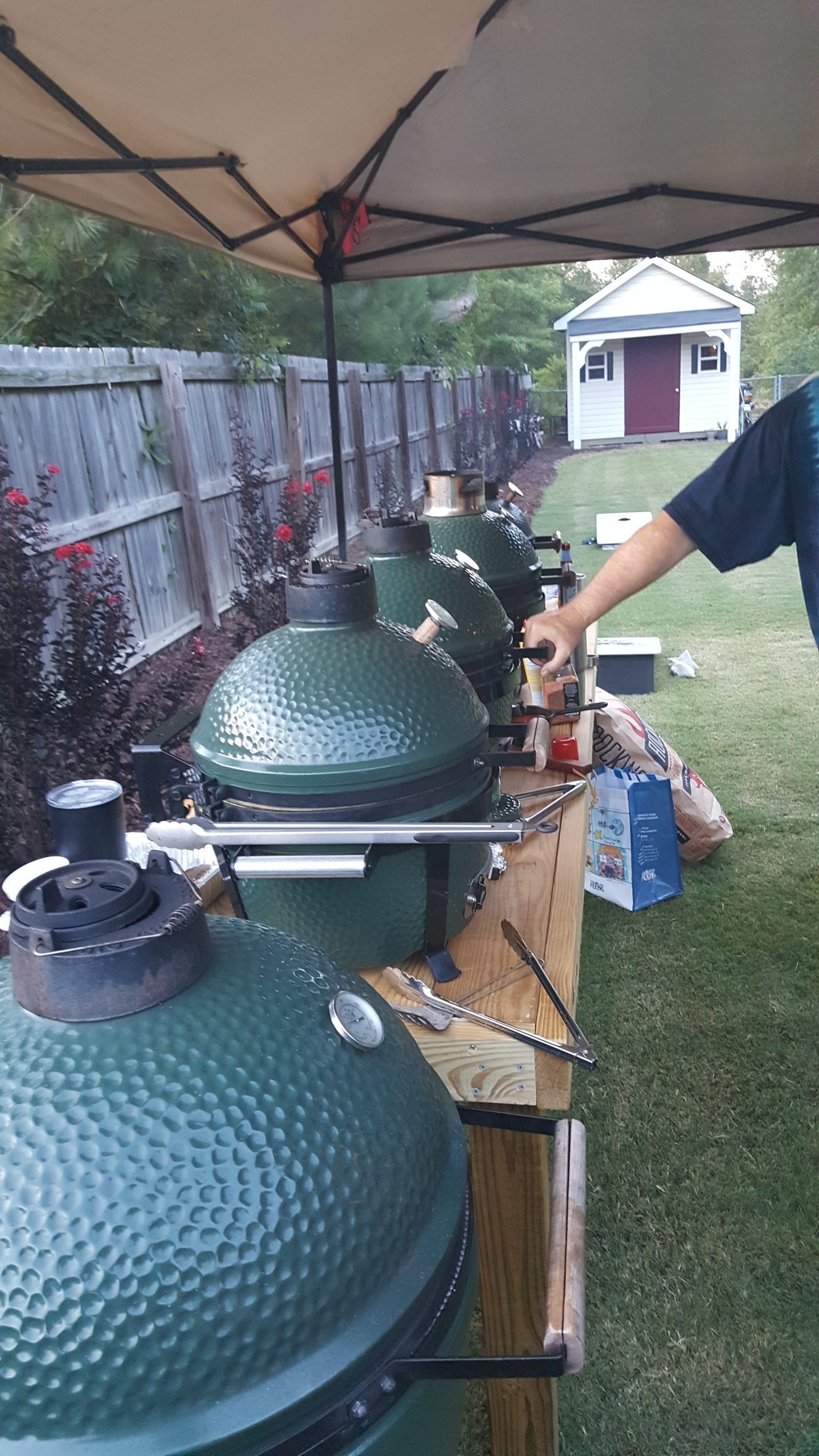 XXL BGE, Karebecue, Klose BYC, Chargiller Akorn Kamado, Weber Smokey Mountain, Grand Turbo gasser, Weber Smoky Joe, and the wheelbarrow that my grandfather used to cook steaks from his cattle