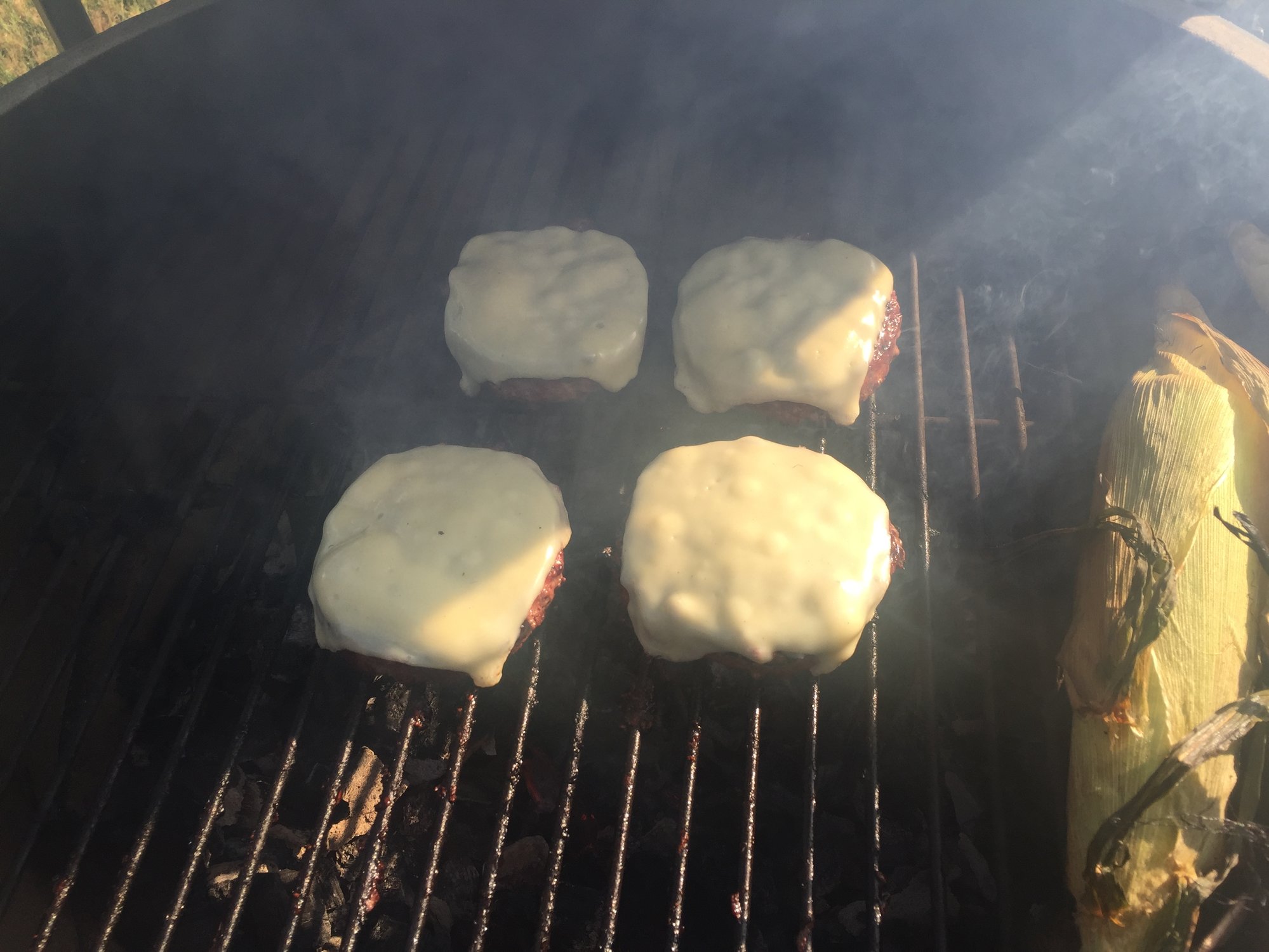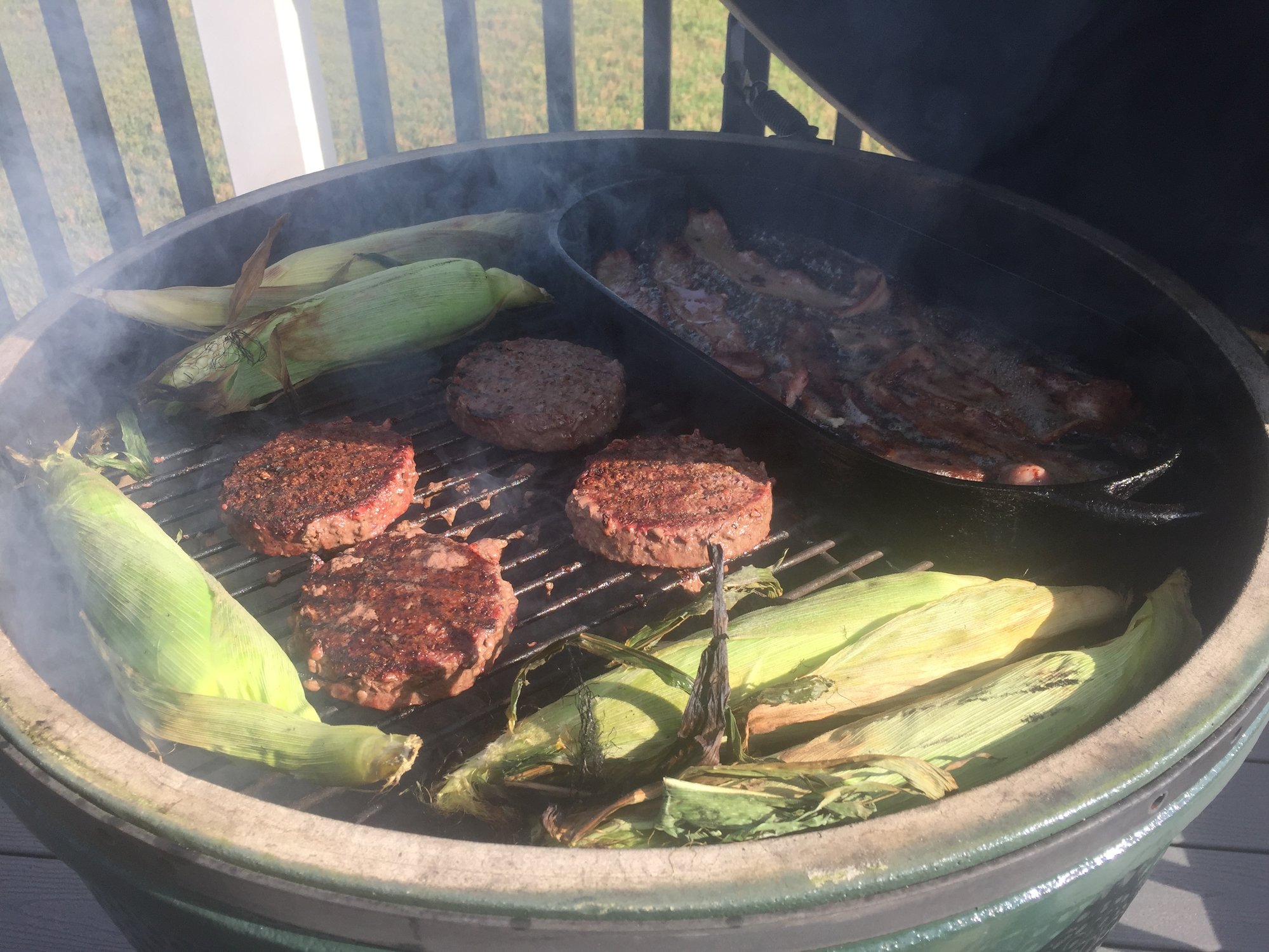 Fired up the XL and put the cast iron pan in the fry the bacon. Tossed the burgers on and corn.