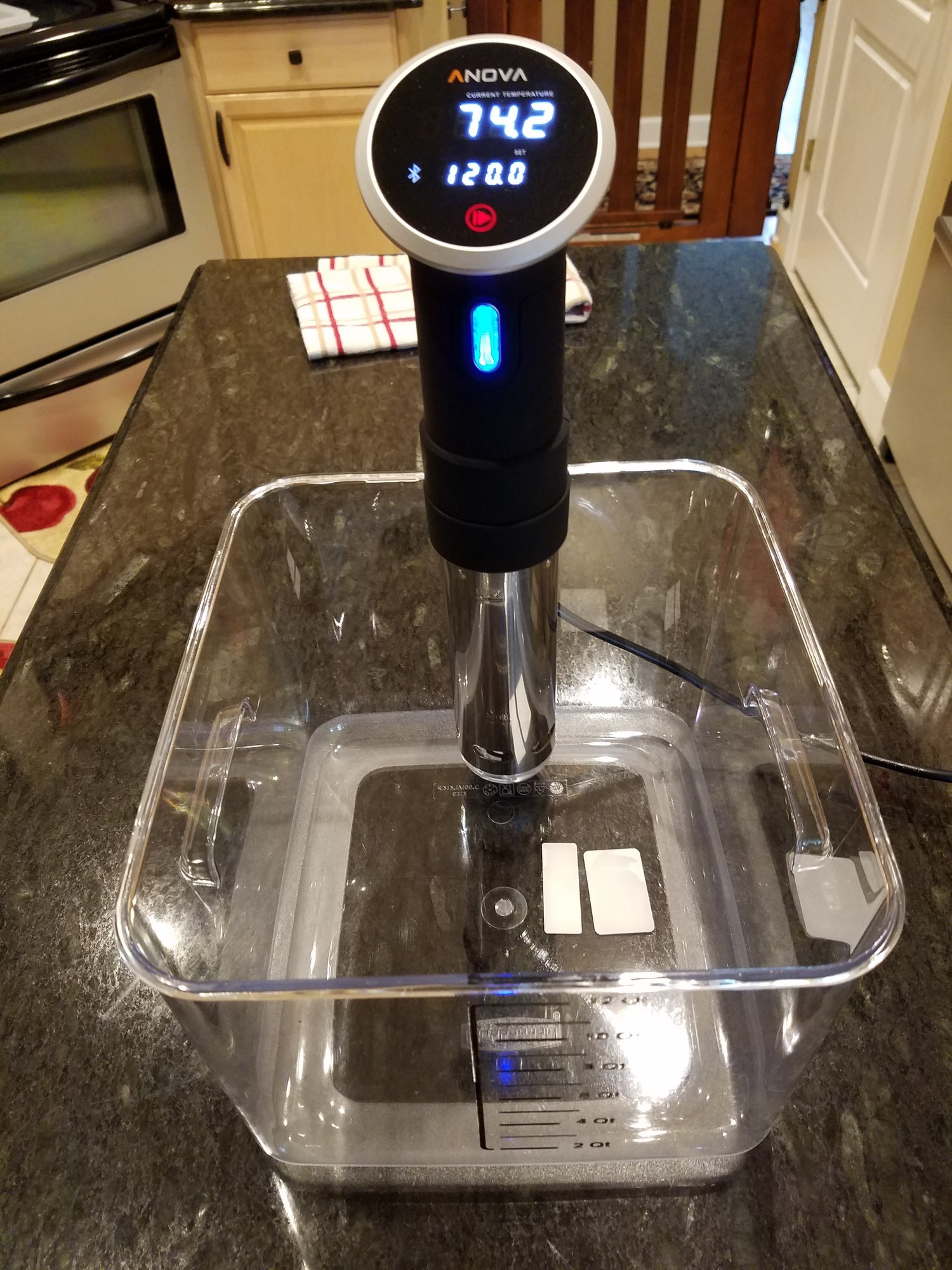 I bought the Anova and the basic of 12 quart tub to begin with and I already see that if I am going to cook larger quantities I will need the bigger tub. But for just the two or three of us this tub will work out fine. Now I have made myself a homemade rack to hold the steaks upright from a $4 Wallyworld paper towel holder and it should do a good job holding the steaks on edge and giving separation.