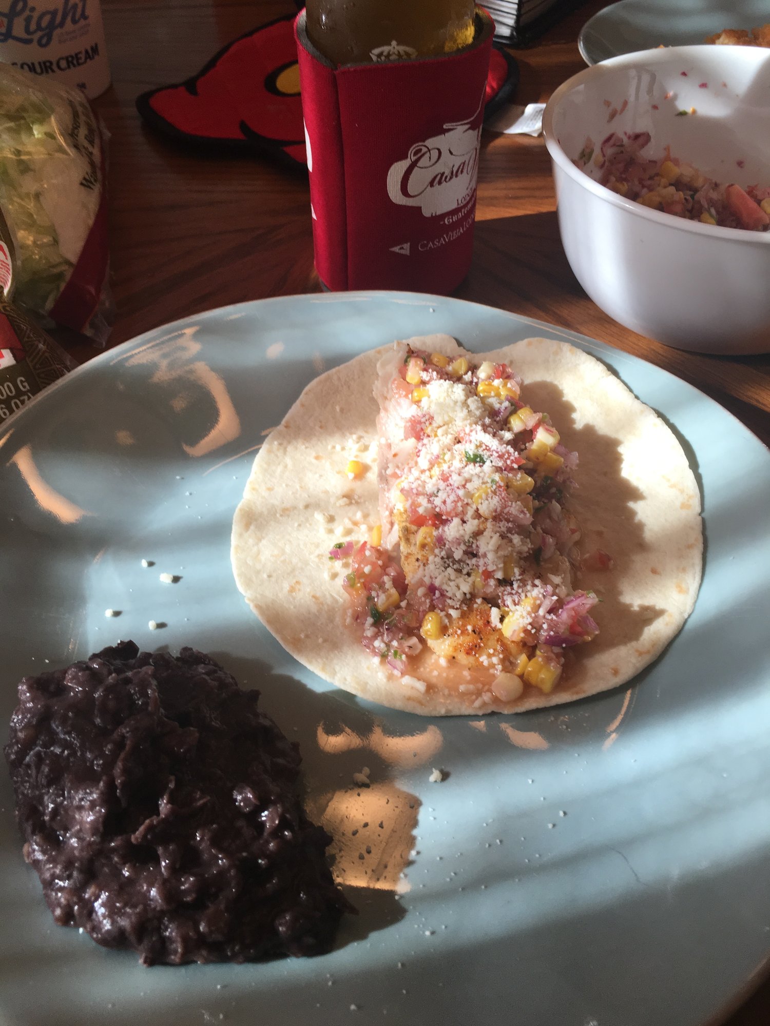 Best fish tacos I have made yet. Roasted the corn and lime for the salsa. Amazing how just a few simple ingredients can deliver lots of flavor. Red snapper for the fish.