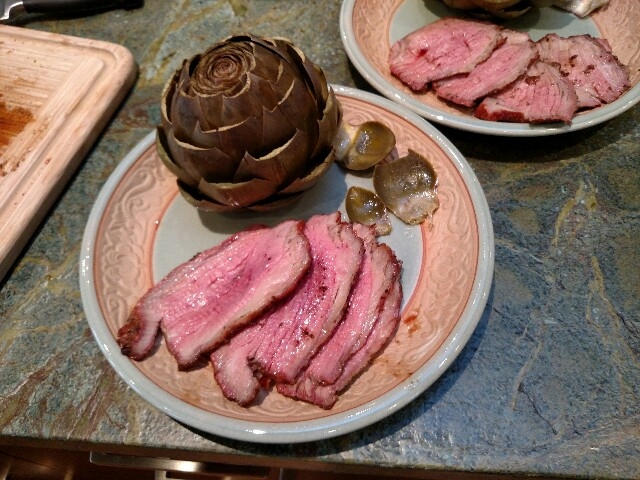 The Artichoke was steamed, not on the Egg. And yes, I do slice with the grain - I know that's wrong, but old habits can be hard to break. Still tastes good