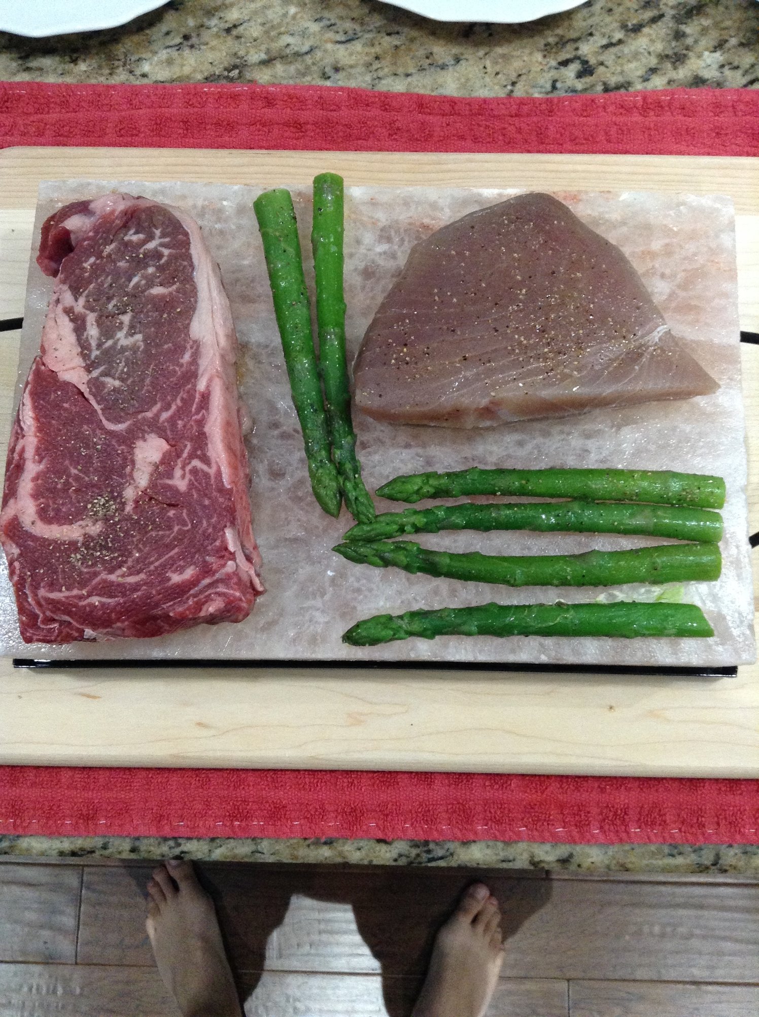 its been while since since I have posted a cook, not sure if this one counts. I got a salt block for Father's Day and tonight was the first cook. Heated the block up in the oven and then pulled it out for the family to see/watch it work its magic. Son and I shared a ribeye, my hot wife had a tuna steak. It was awesome. Looking forward to trying it out on the egg next time. Thanks for looking.