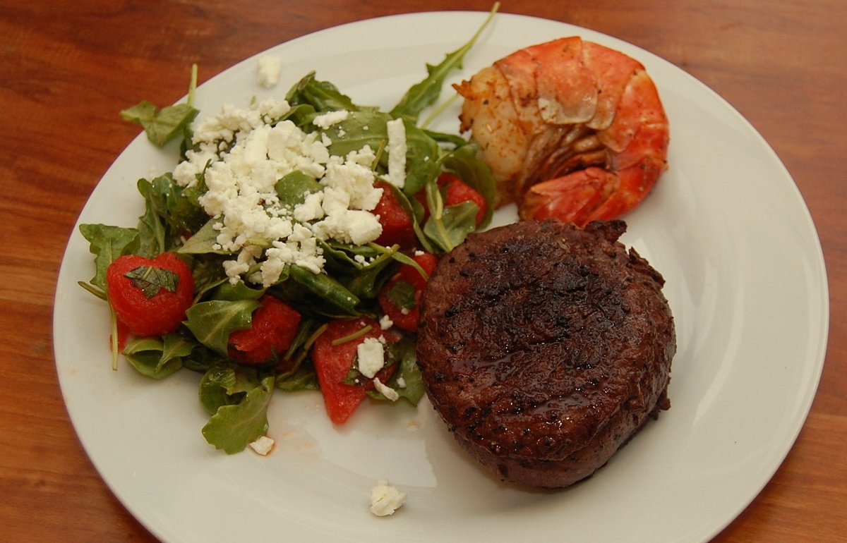 Watermelon feta and mint salad, steak, prawn