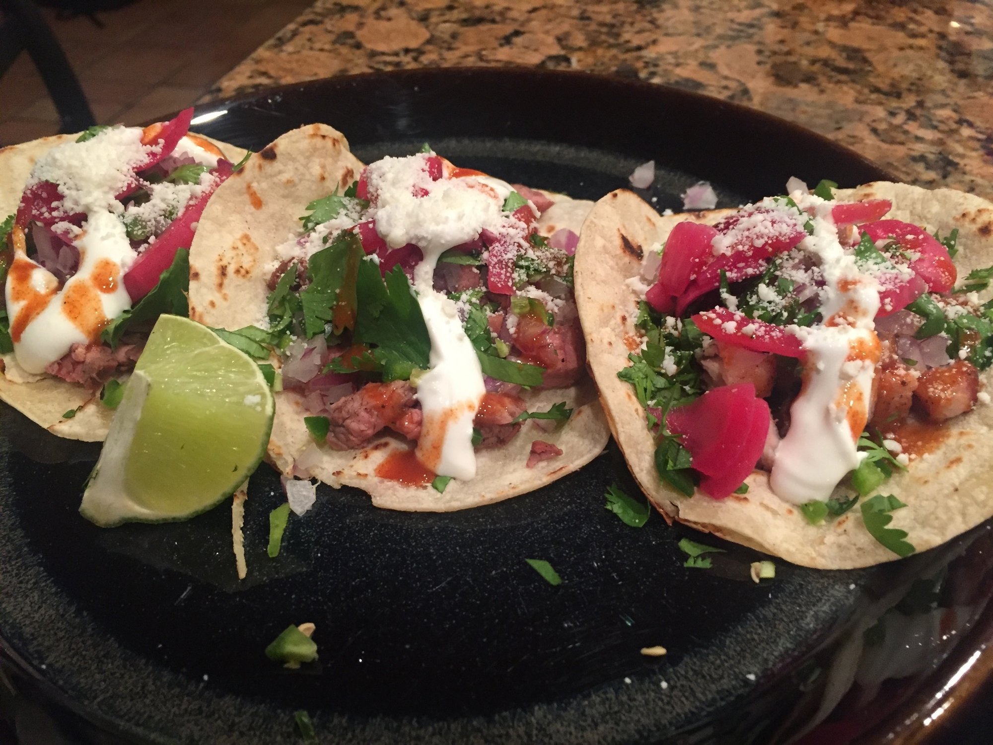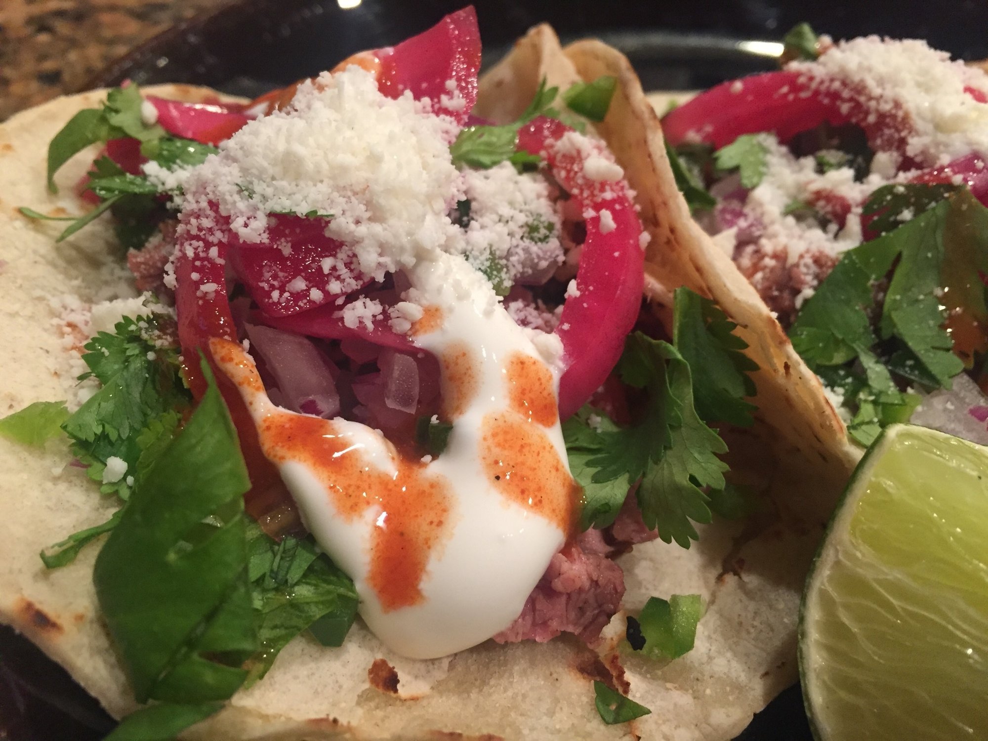Finished taco plate. Toppings were red pickled onions (salt/lime), cilantro, crema, cotija cheese, chopped red onion, jalapeños, tapatio for extra spice and a squeeze of lime juice...