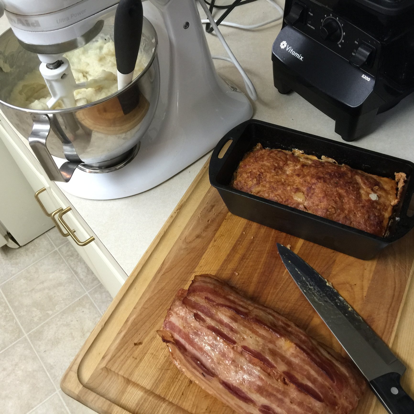 Trying my first meatloaf this afternoon. Used standard recipe from Joy of Cooking. Bought a mix of fresh beef, veal, and pork from the grocery store, too much so ended up with two loafs. Added some stale Lays chips and wrapped one of them in bacon, just 'cause. Cooking one in my new Lodge pan, the other just on foil... Also doing some foil wrapped taters to mash later. More to follow!