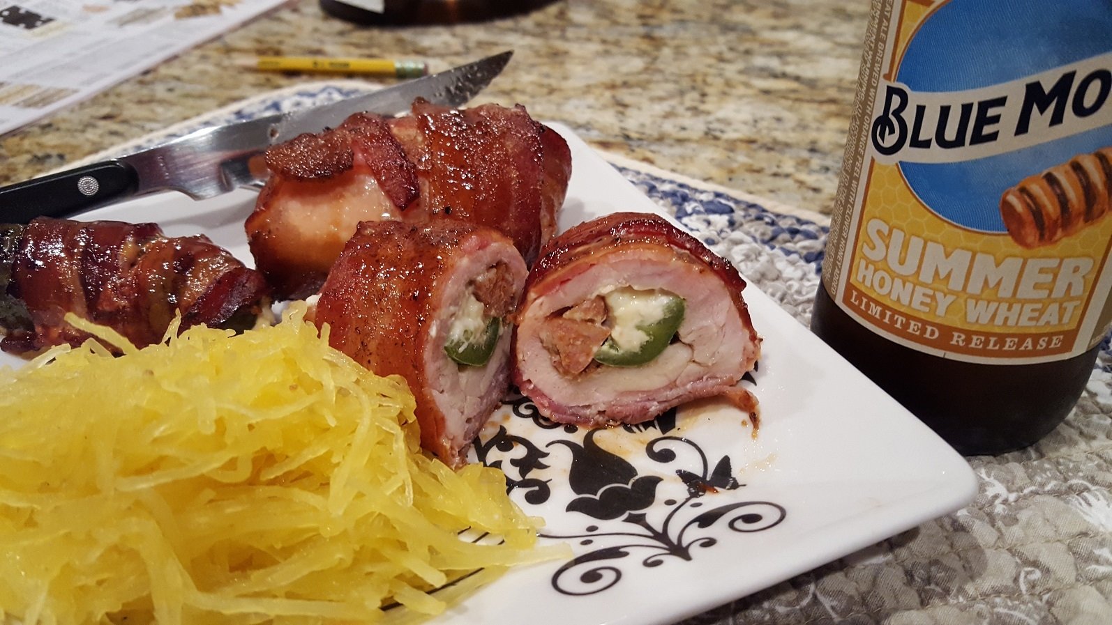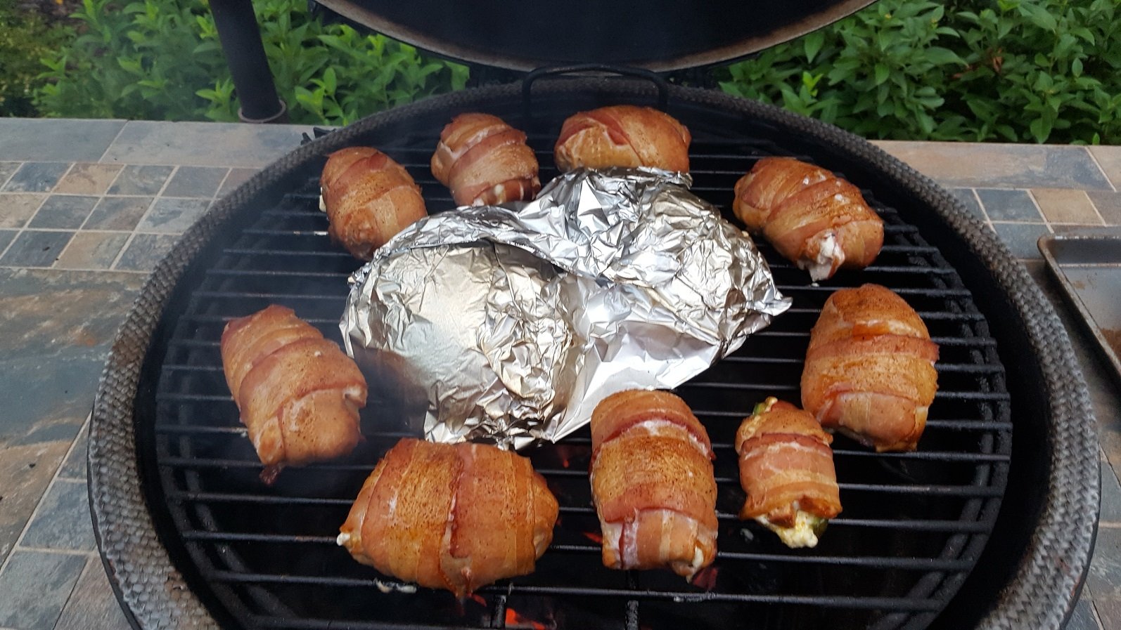 Thanks @deadlyfrog for getting the chicken bombs started. I'm on my own this weekend so decided to do some chicken bombs too. Used thighs and was able to fit a piece of chorizo in there with the jalapeno, cream cheese and monterey jack. A bit of Bryons on bacon and cooked raised direct st 350 for 45 min. Sauced with the BBQ sauce I won at the NC Butt Blast!