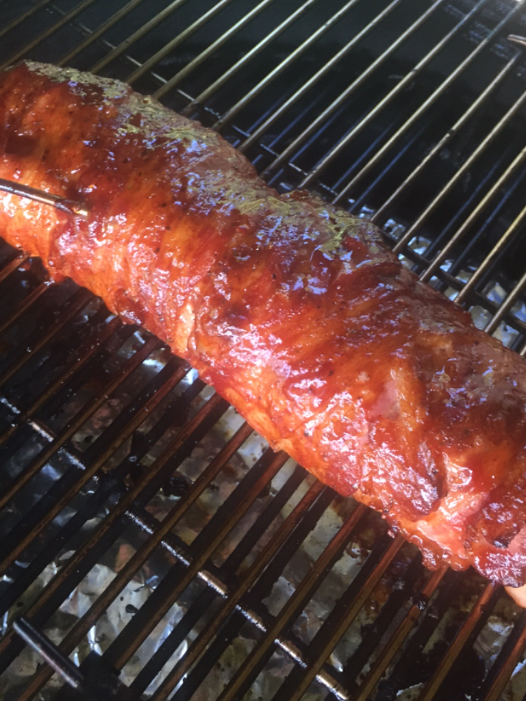 My brother invited me over for pork tenderloin yesterday. For it we sprinkled it with Bad Byron's Butt Rub, wrapped it with plenty of bacon and cooked it indirect at 300 degrees to an internal temp of 145 degrees, using cherry wood for a good smoke. Did baste it with a mixture of honey and Sweet Baby Ray's BBQ sauce before taking it off. Then let it sit, covered in foil after taking it off, for about 15 minutes. It was very good, moist and tender.