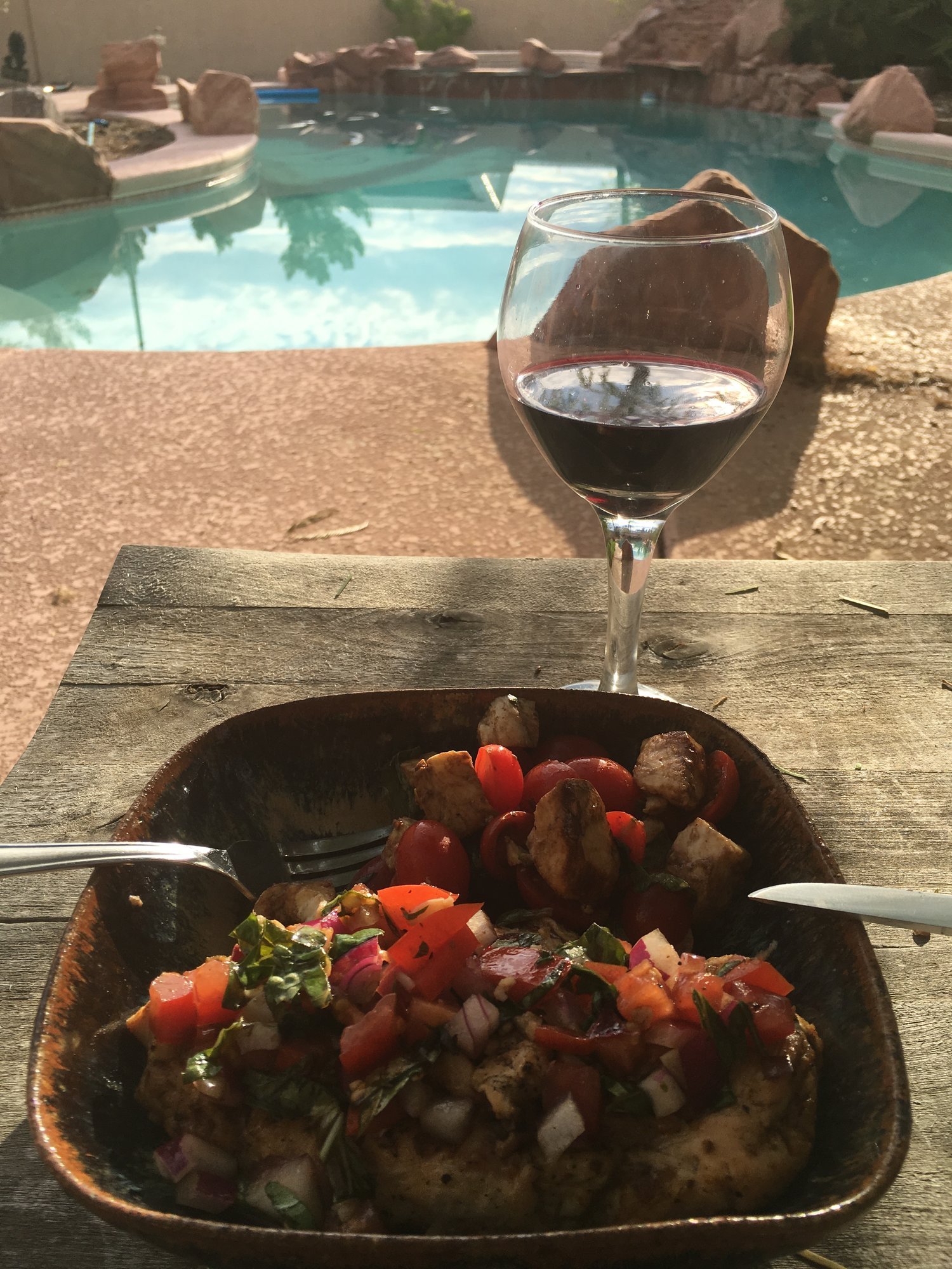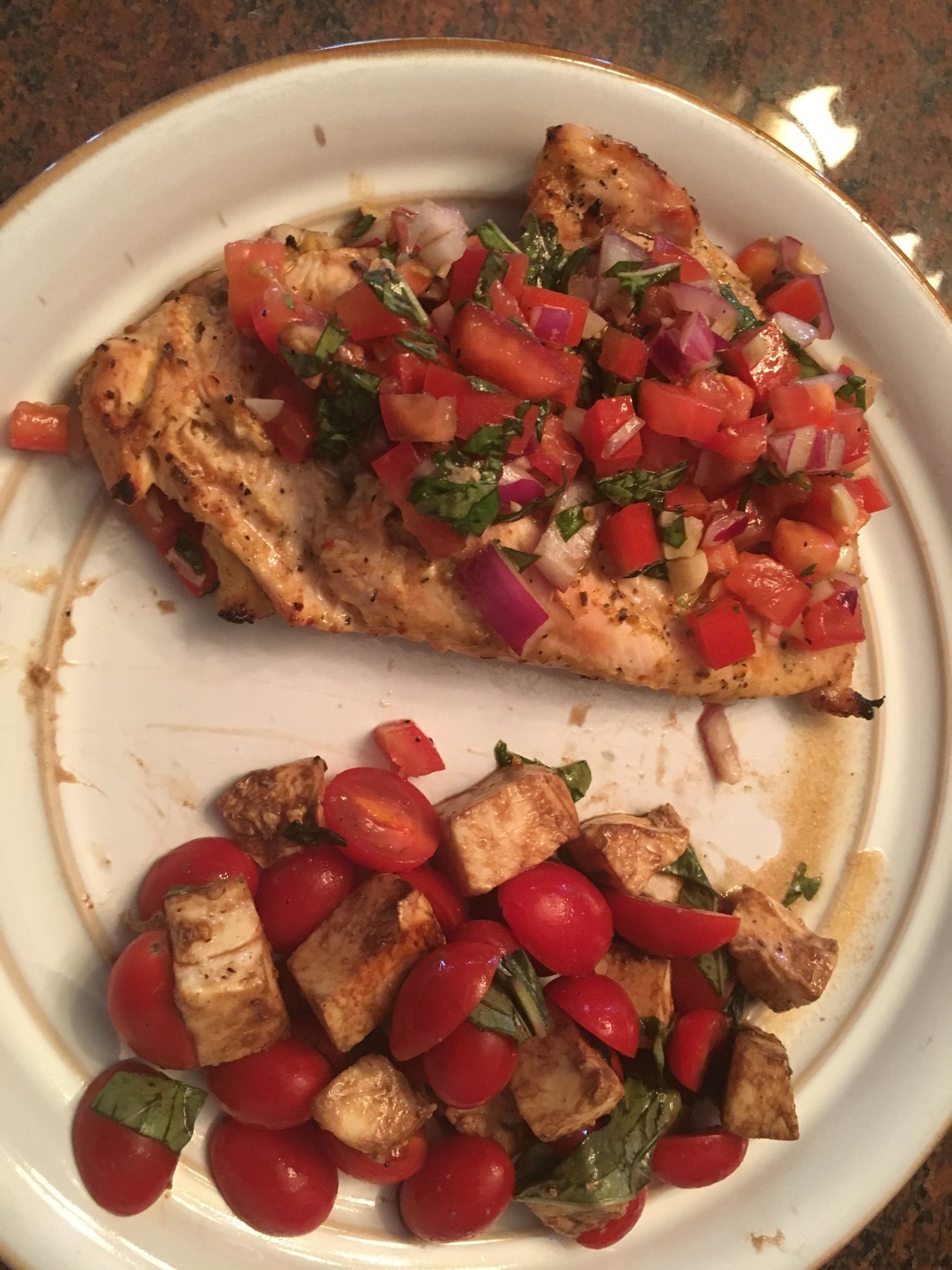 After some inspiration from this forum, I decided to branch out a little bit. Had a bunch of cherry tomatoes that needed using. So I made a marinade of EVOO, Red Wine Vinegar, Balsamic Vinegar, Italian seasoning and red chili flakes. Pounded out a package of chicken breasts and marinaded for most of today. I made a bruschetta topping for the chicken consisting of tomatoes, garlic, red onion, basil, EVOO & S&P. Grilled chicken raised direct for about 20 minutes. Served with a caprese salad. Awesome meal.