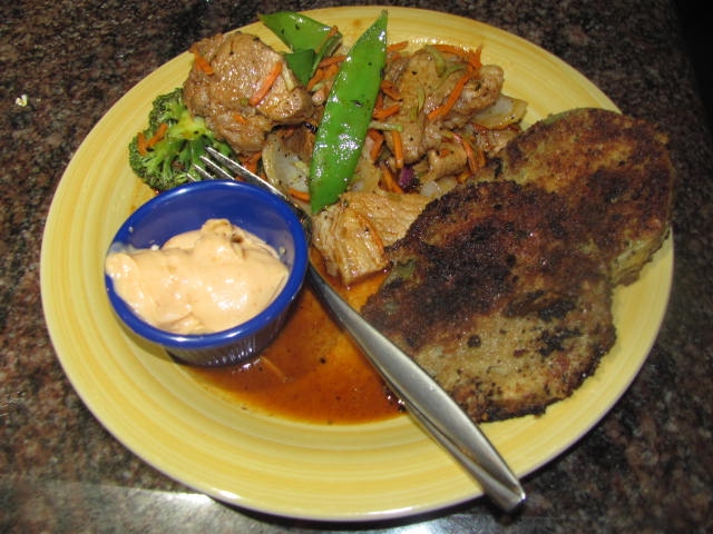 Have a cool GoPro video of the wok cook, but the site won't accept it for posting. Plated pic will have to do. I did the wok while The Spouse fried the green tomatoes. I have got to figure out how to share the video.