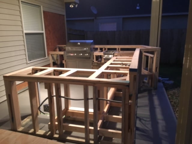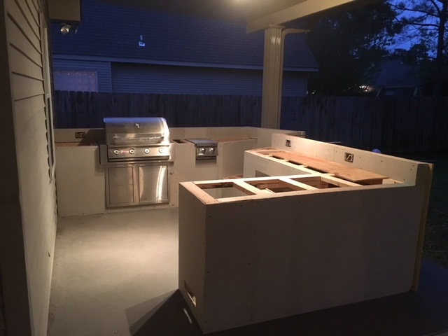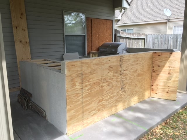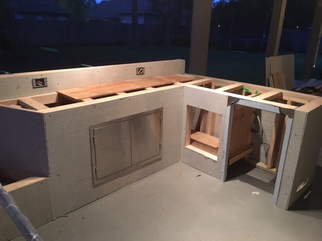 So I started construction on my outdoor kitchen.  framed up with PT lumber, 1/2" Durock sheathing.  All seams taped up with Pella window/door tape.  The plan is to install Trex Spiced Rum fascia around the outside and top off with granite.