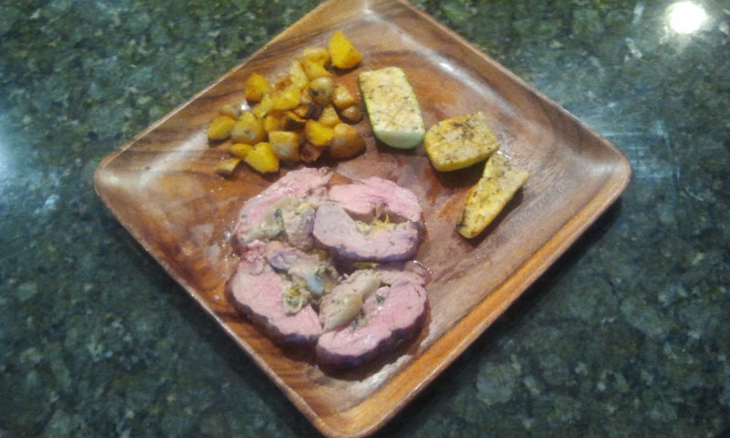 Sandwiched pork tenderloins stuffed with artichoke, spinach, onion and cheese; a few Yukon gold potatoes and some zucc and squash. Dang near too healthy for me.