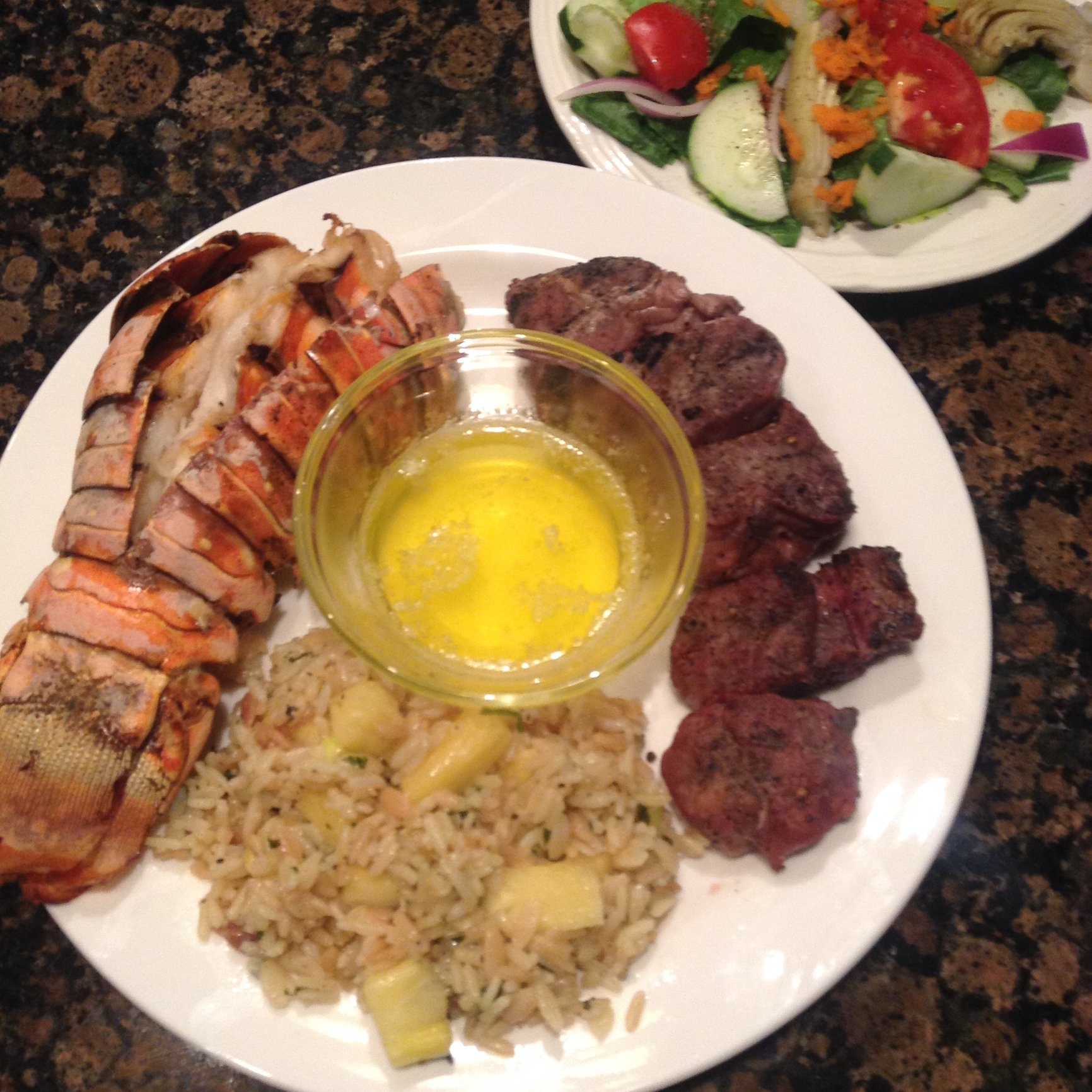 Skewered ribeye from my BIL's cow, quick seared on the coals, then grilled along with warm water tails. Grilled pineapple for my much better halfs Hawaiian rice pilaf. Clarified butter and a salad with artichoke hearts and stuff. I'm stuffed!