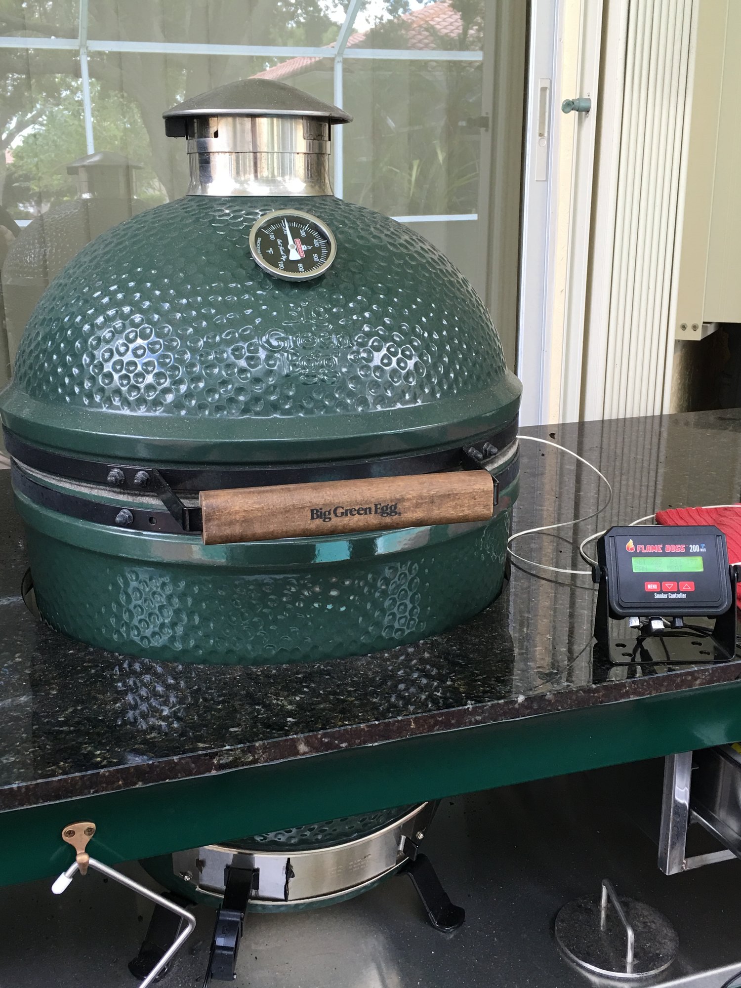 Egg getting hot. FlameBoss 200 controlling temp. Used a few chunks of apple and cherry. 50/50 new and old RW lump.