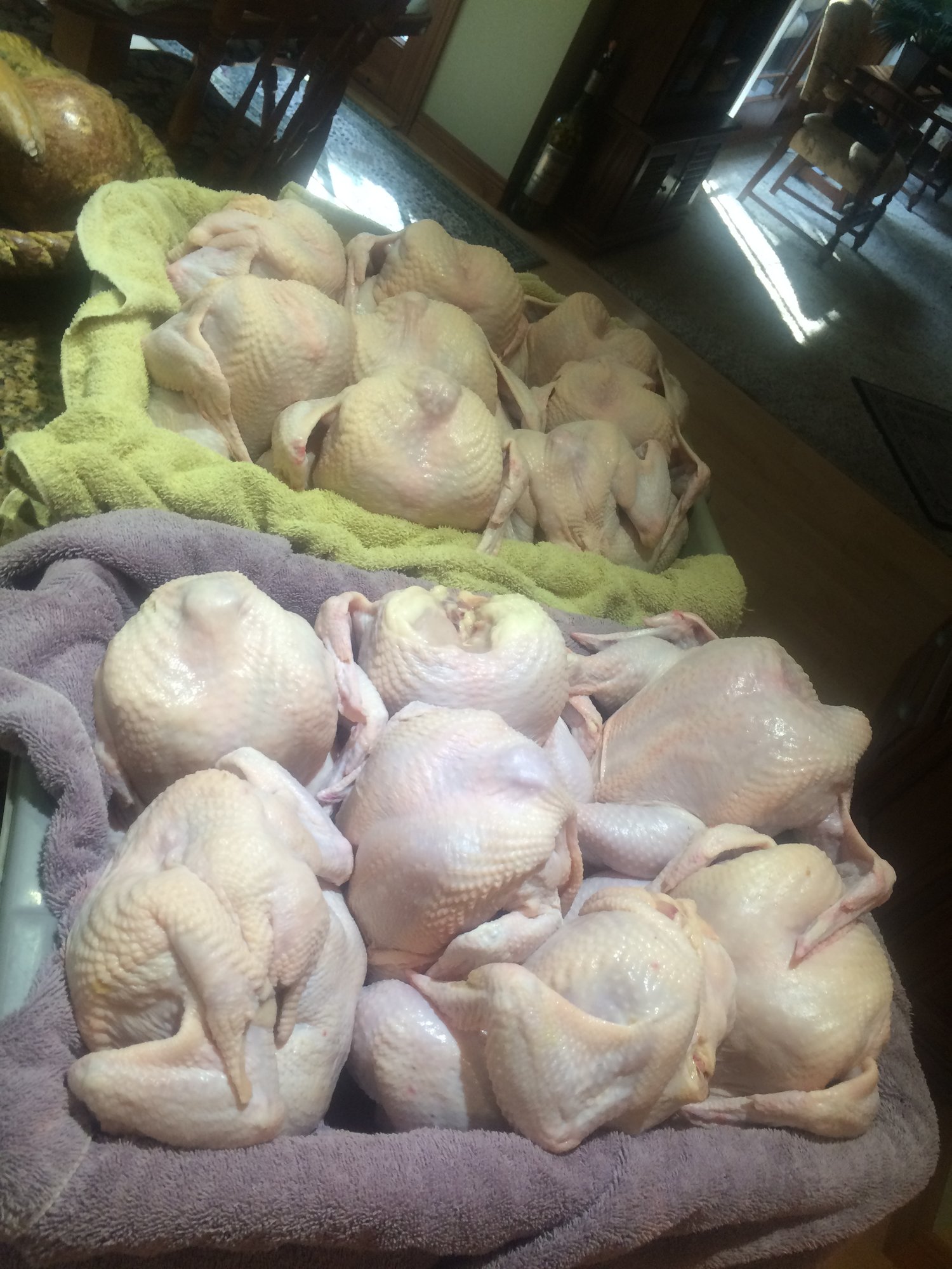 Oh yes. We had 64. Cleaned 30 last Wed. They average 5 lbs dressed. Another 24 this week will be parted out and the final 10 will be roasters in a couple of weeks (8-10 llbs)In the bush just East of Cambridge,Ontario