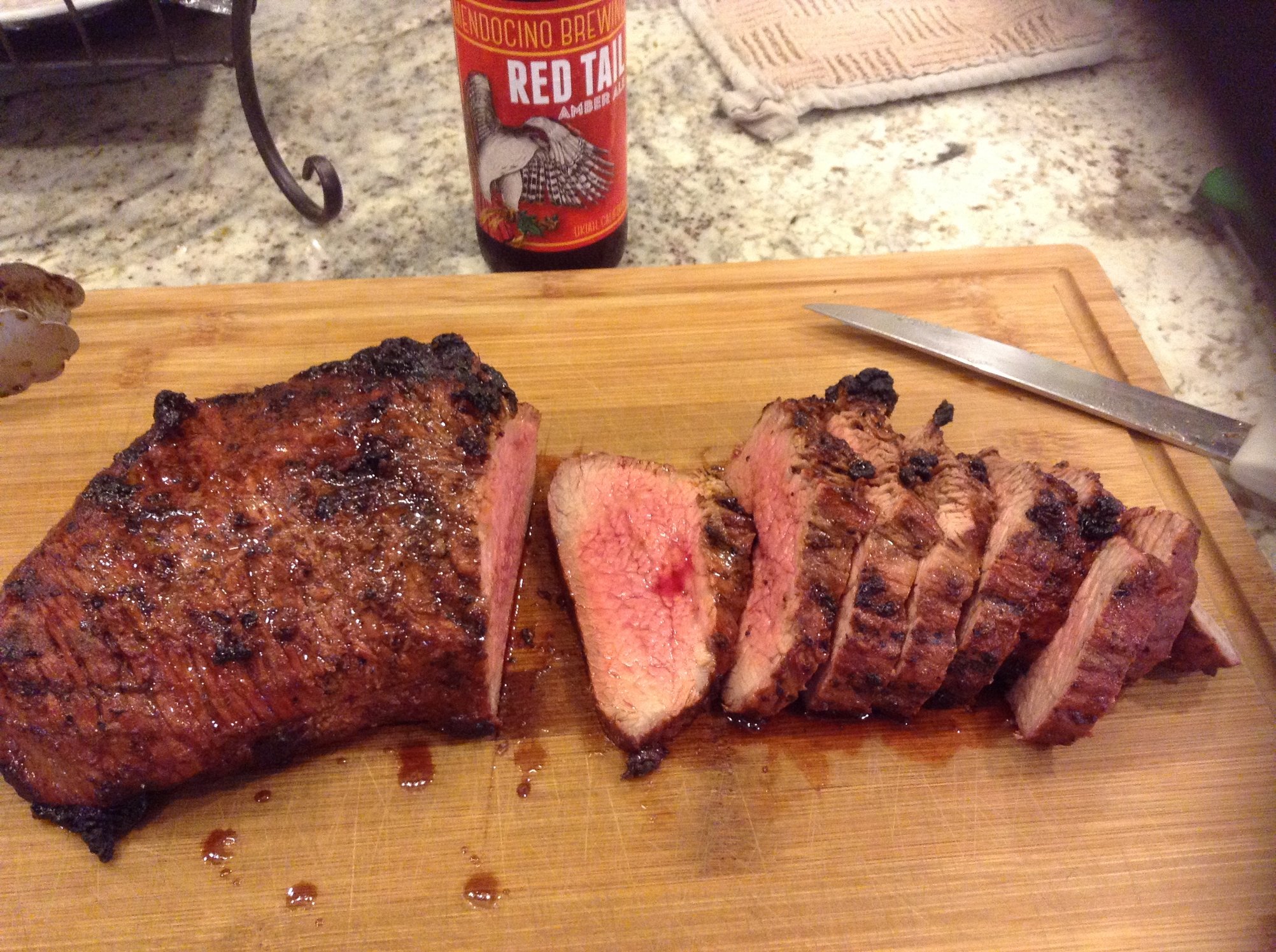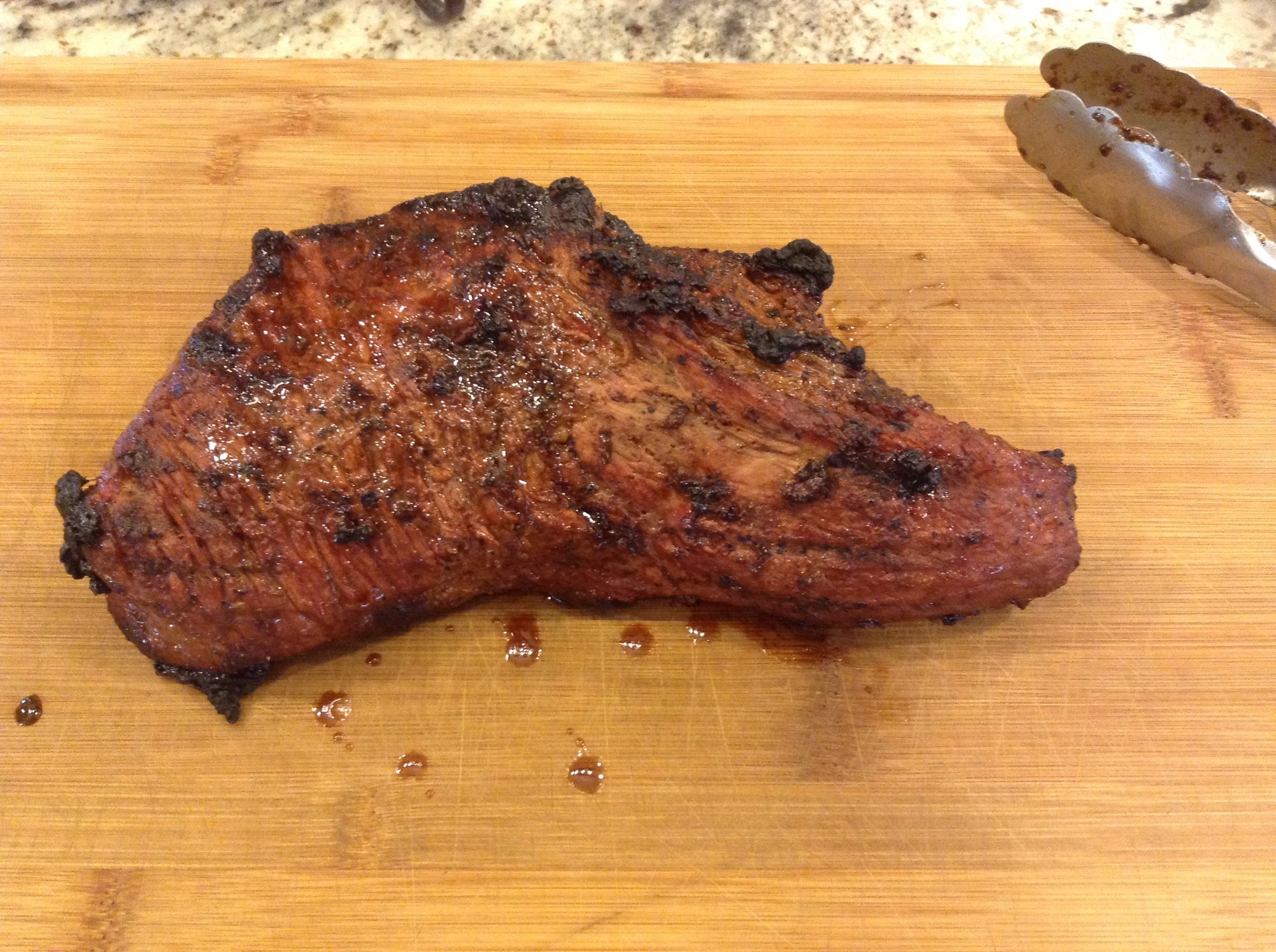 havent posted a cook in a while so here goes: forward sear at stock grid level approx 475 degrees. 10 min per side. Pull meat, insert Adjustable rig with ceramic plate on bottom level, tri tip on top level. This brought the temp down to approx 350 where the cook finished for approx 20 more minutes. Pulled at 138-140. Cut against the grain and enjoy, accompanied with some Red Tail Ale.