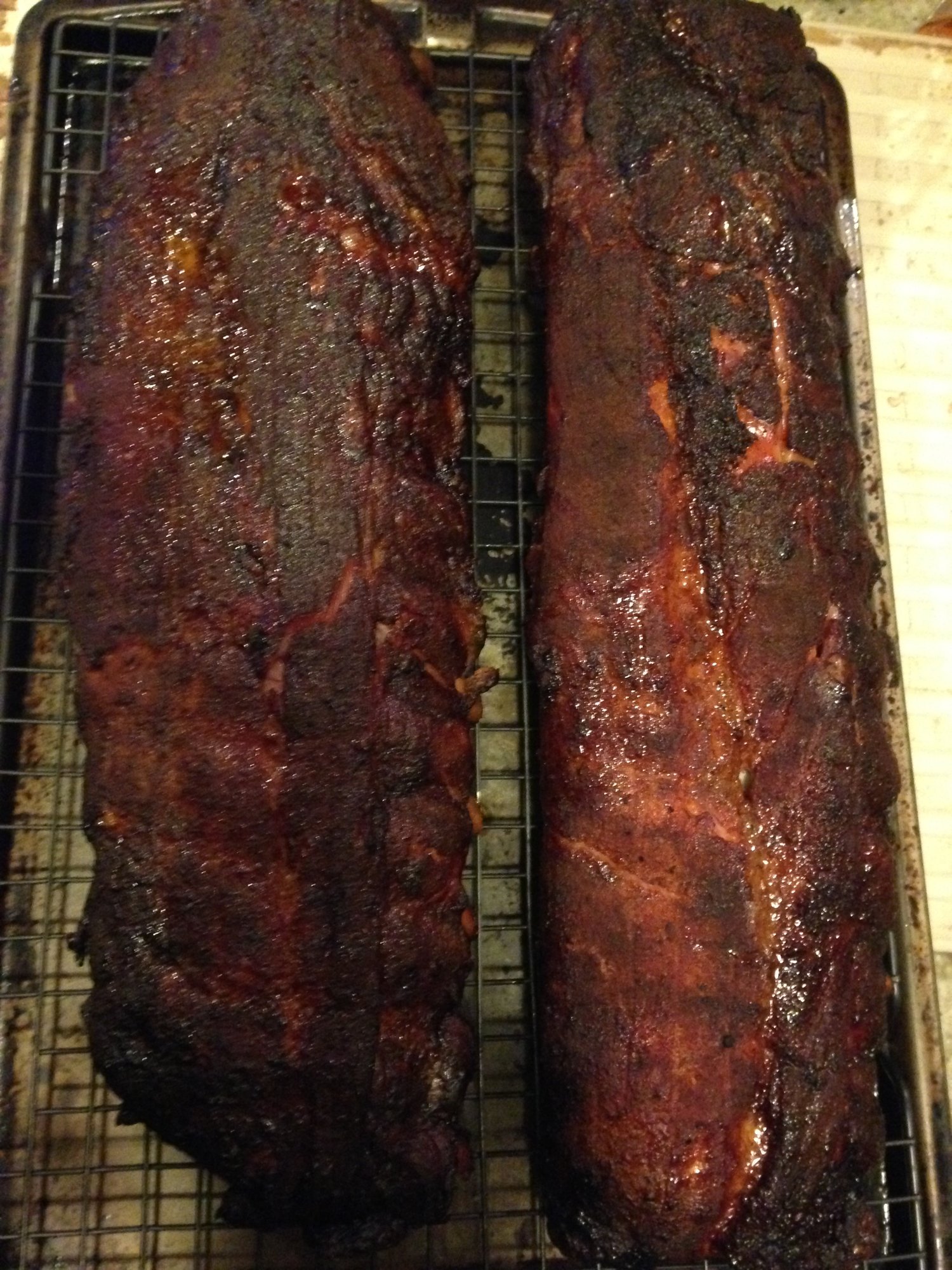 Here are the ribs, pulled after 5 hours in the BGE at 250, passed the bend test nicely!