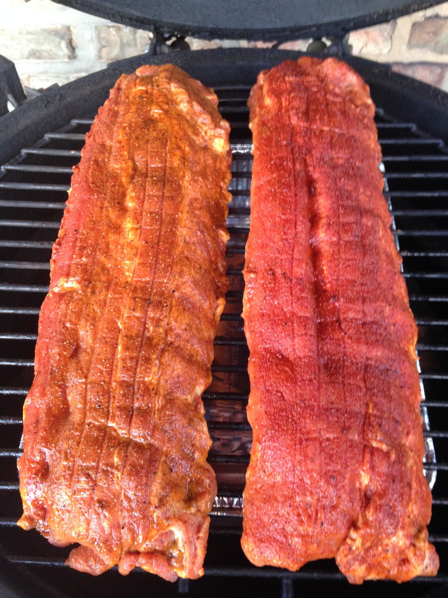 Two racks ready for the smoker, one rubbed with Meat Church Hot Honey Hog BBQ (LOVE this stuff) and the other with BarBQphoria Smokey Rub (I believe this is local to Midwest)...here we go!