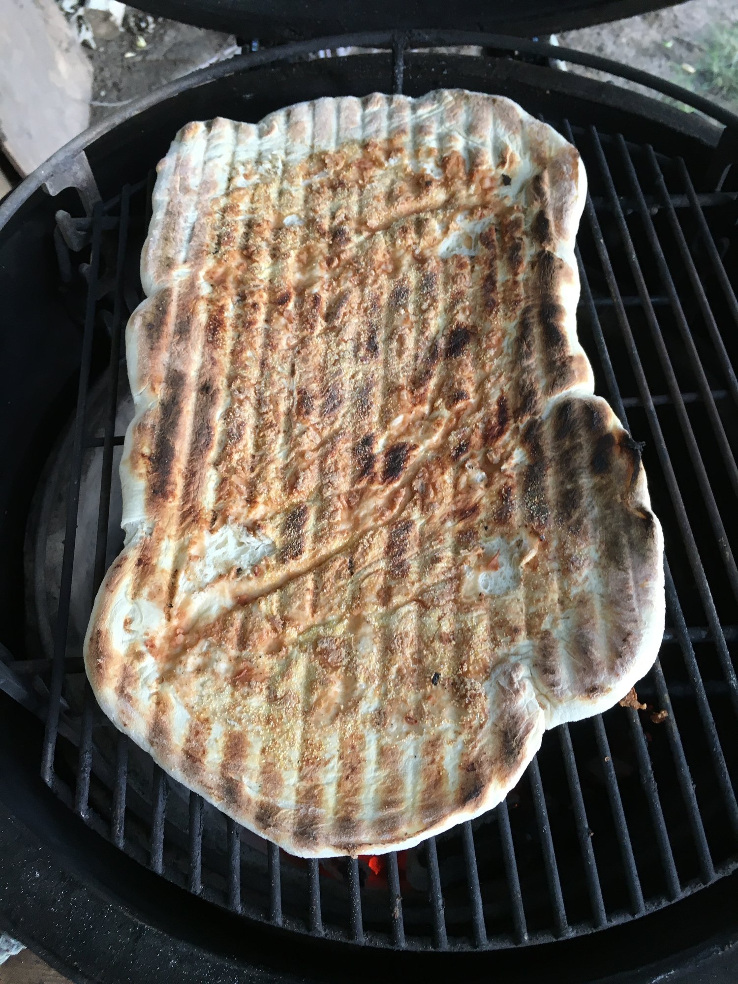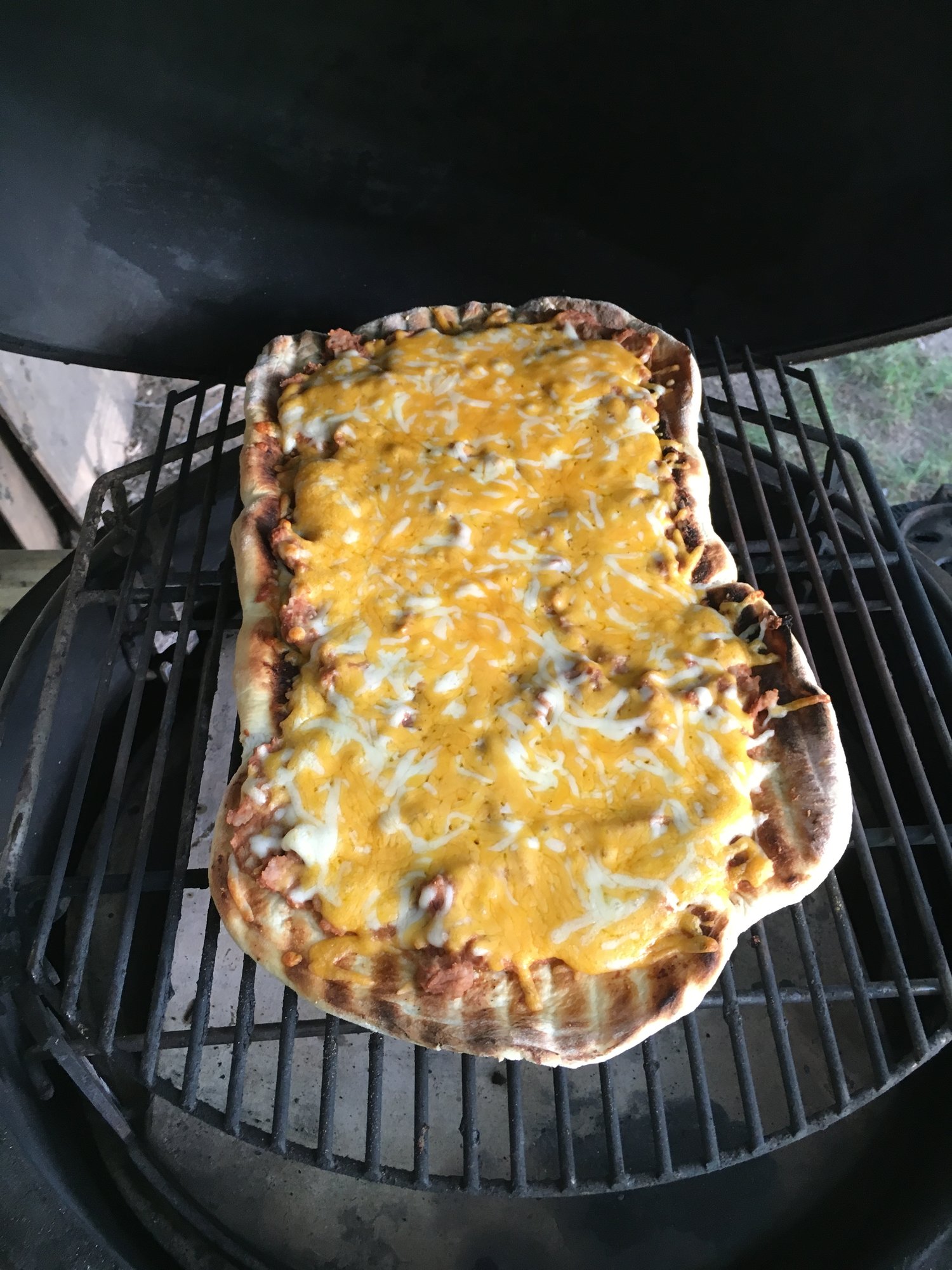 Its a Friday night thing. Indirect high in the dome at 550 for about 15 minutes using simple homemade dough. Flour, yeast, salt, sugar and warm water. Second one is direct grilled bread dough for taco then indirect to get cheese browned up!