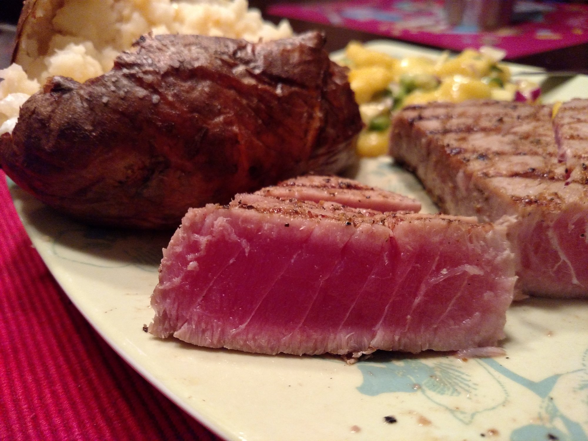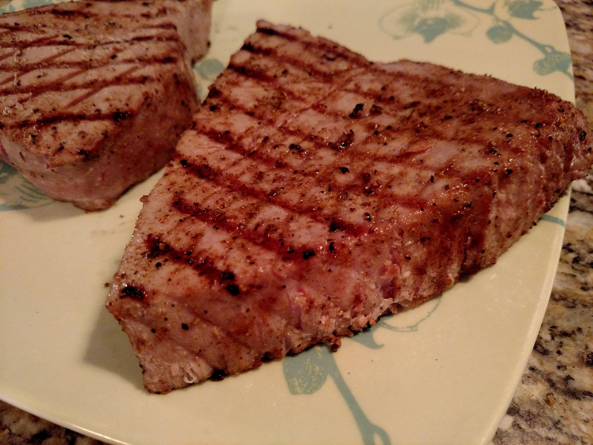 I ended up with both as the Mrs evidently forgot to tell me she wasn't as crazy about yellowfin as I am.   As far as ease of prep and finished product this might be my favorite cook.   Brushed with oil, sprinkled with DP Raging River.  500 for about 90 seconds (or so) per side.