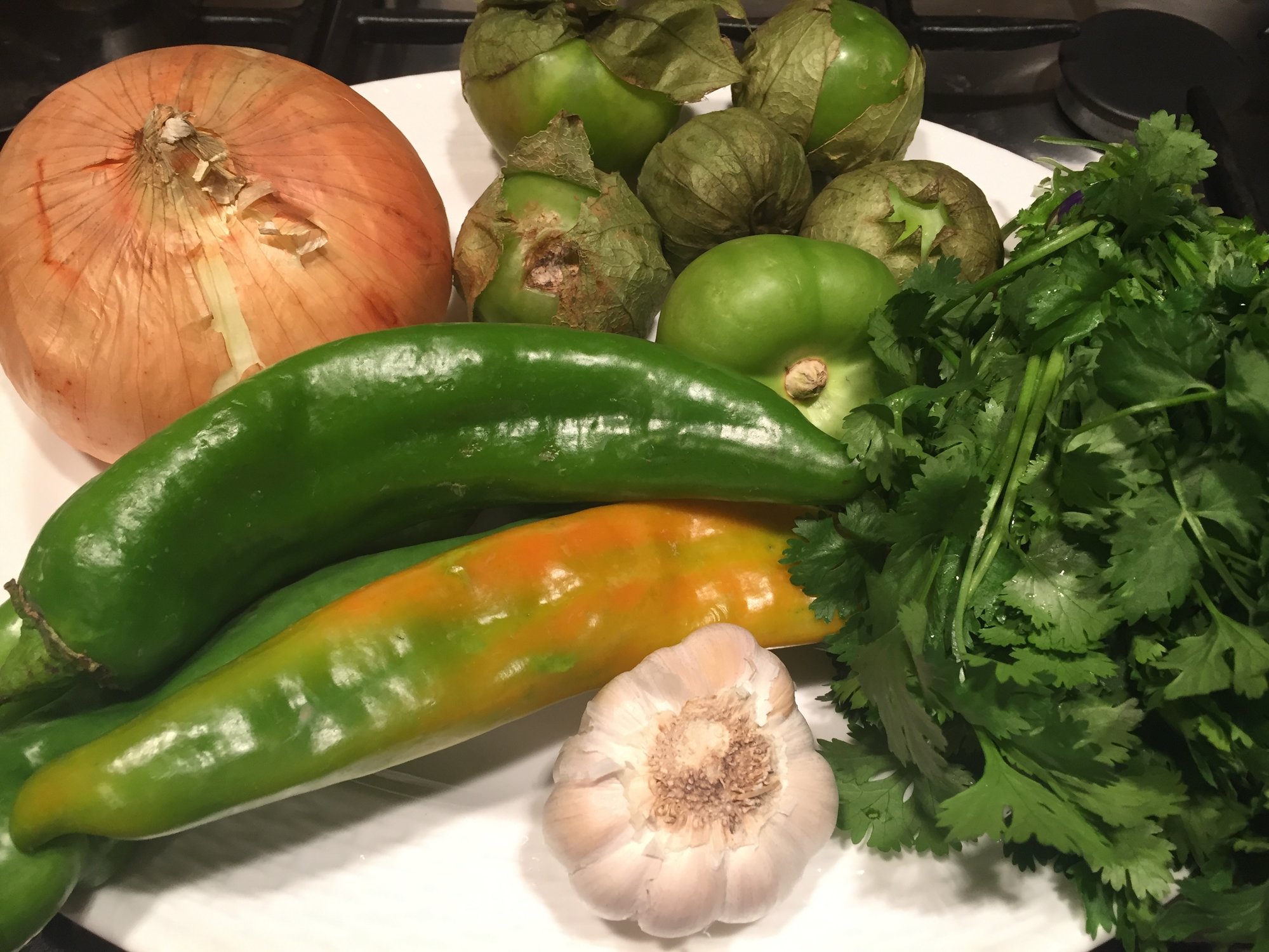 The total ingredients were: Tomatillos, Hatch Chili Peppers, Onion, Cilantro, Chicken Stock (low sodium) Garlic, Salt & Pepper.