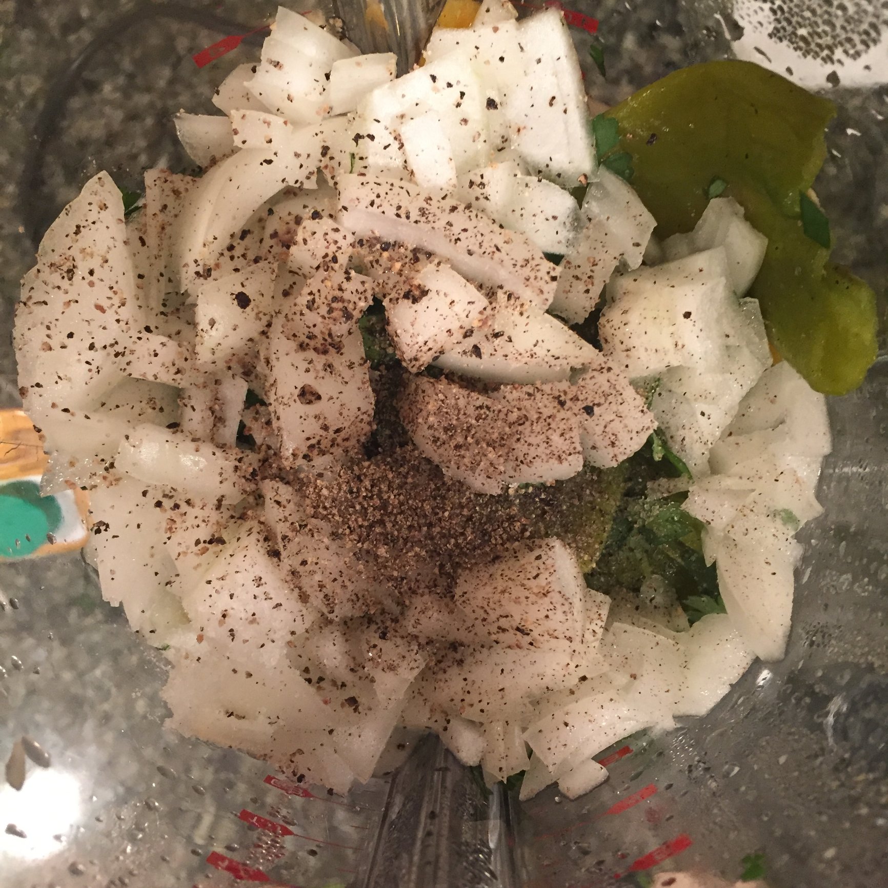 Looking down into the blender with all ingredients before blending: