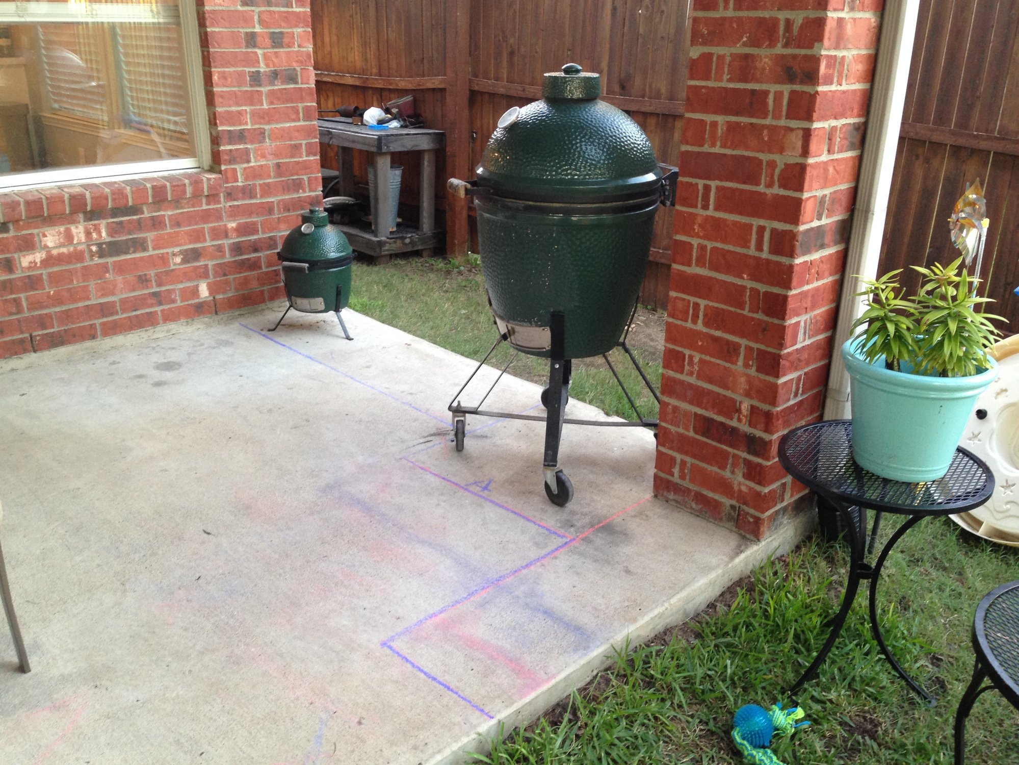 And finished up the evening by starting to map out a new table/outdoor kitchen type area. Sidewalk chalk is good for something other than keeping kids entertained.