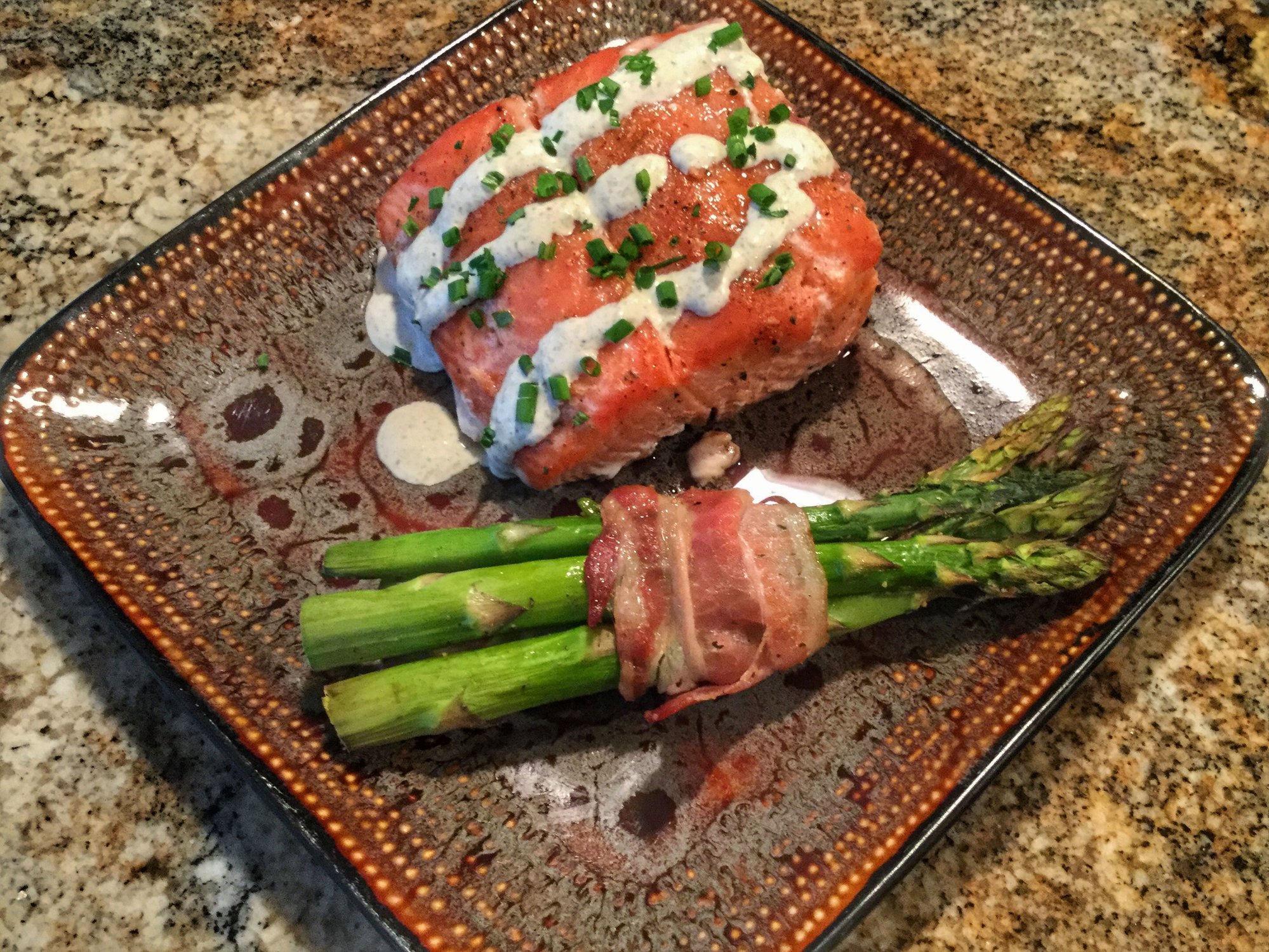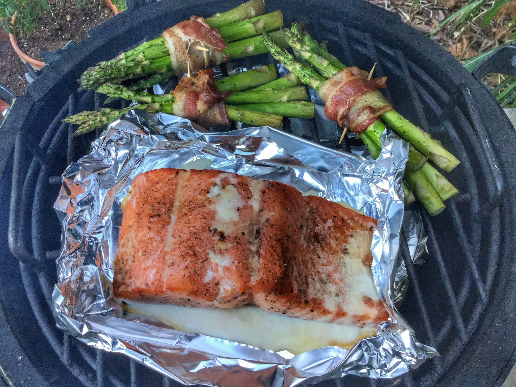 Wrapped up some asparagus with some partially cooked bacon, on the egg 30mins after the salmon went on. 90 mins later it's time to pull.