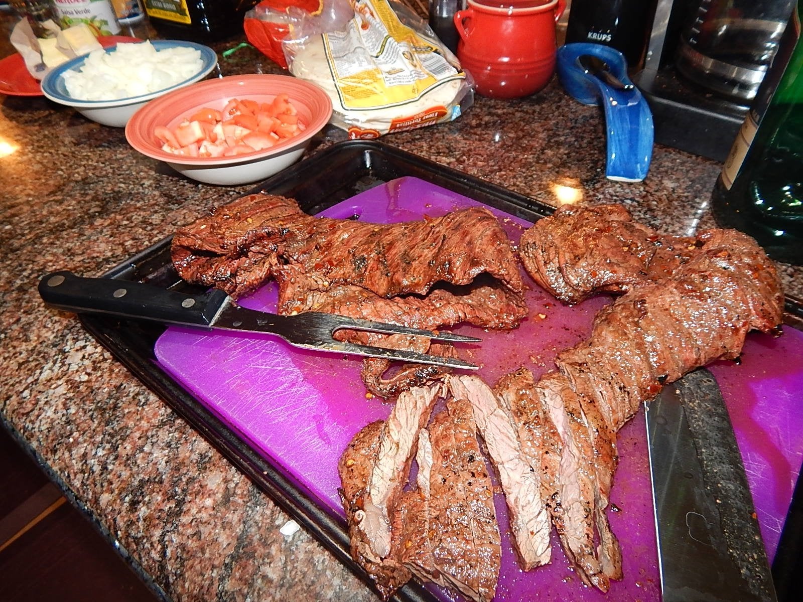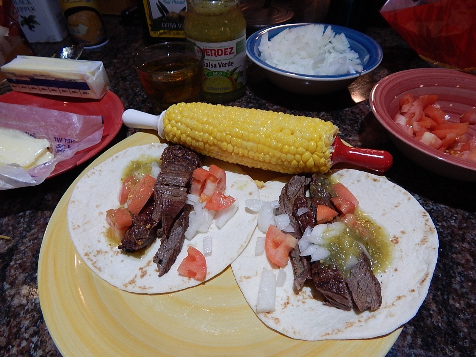 Marinated skirt steak, onions, tomatoes, salsa verde on flour tortillas.