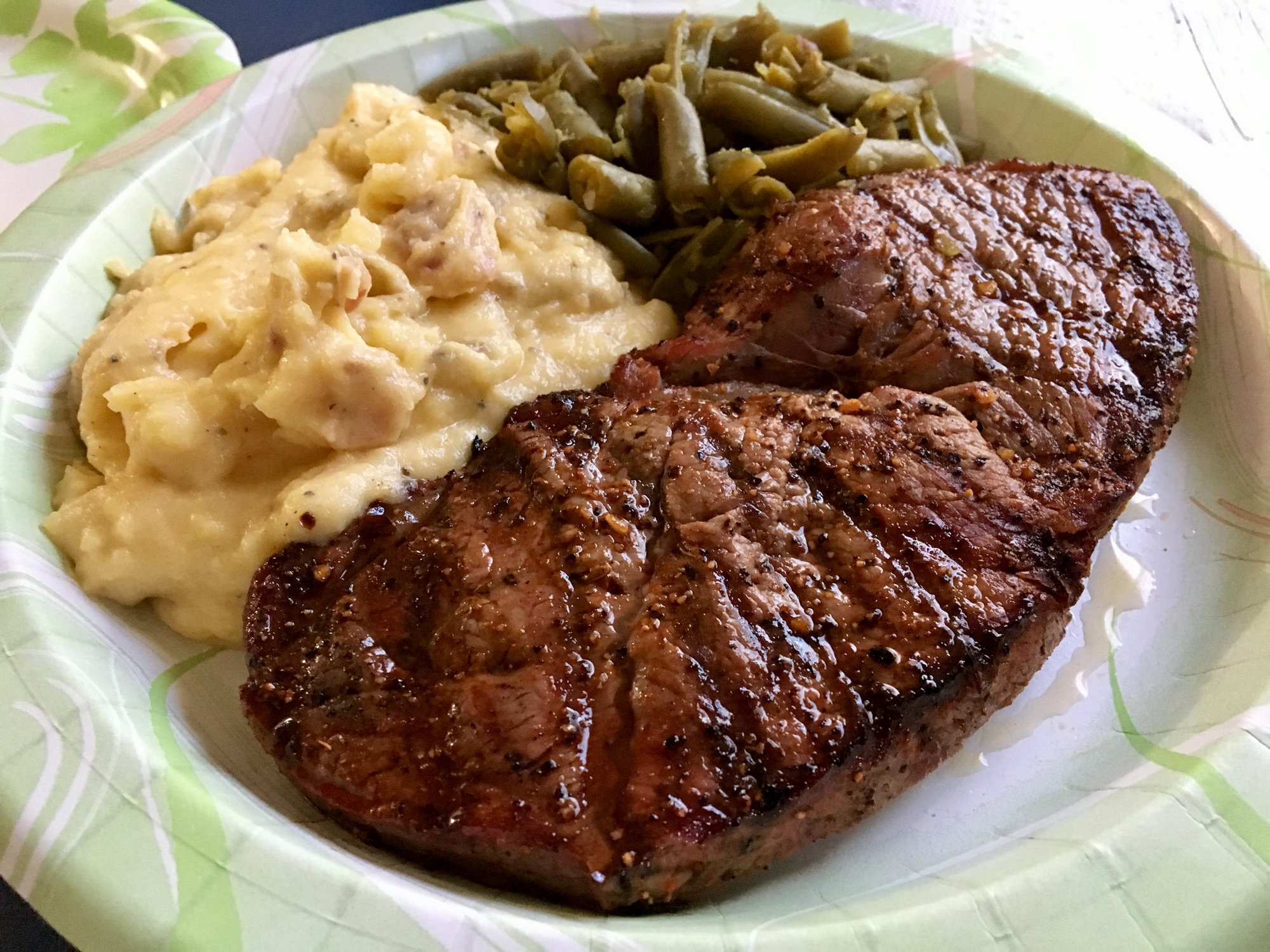 Some sirloin steak, cheesy mashed potatoes, and green beans for dinner. Not bad for a Sunday night.