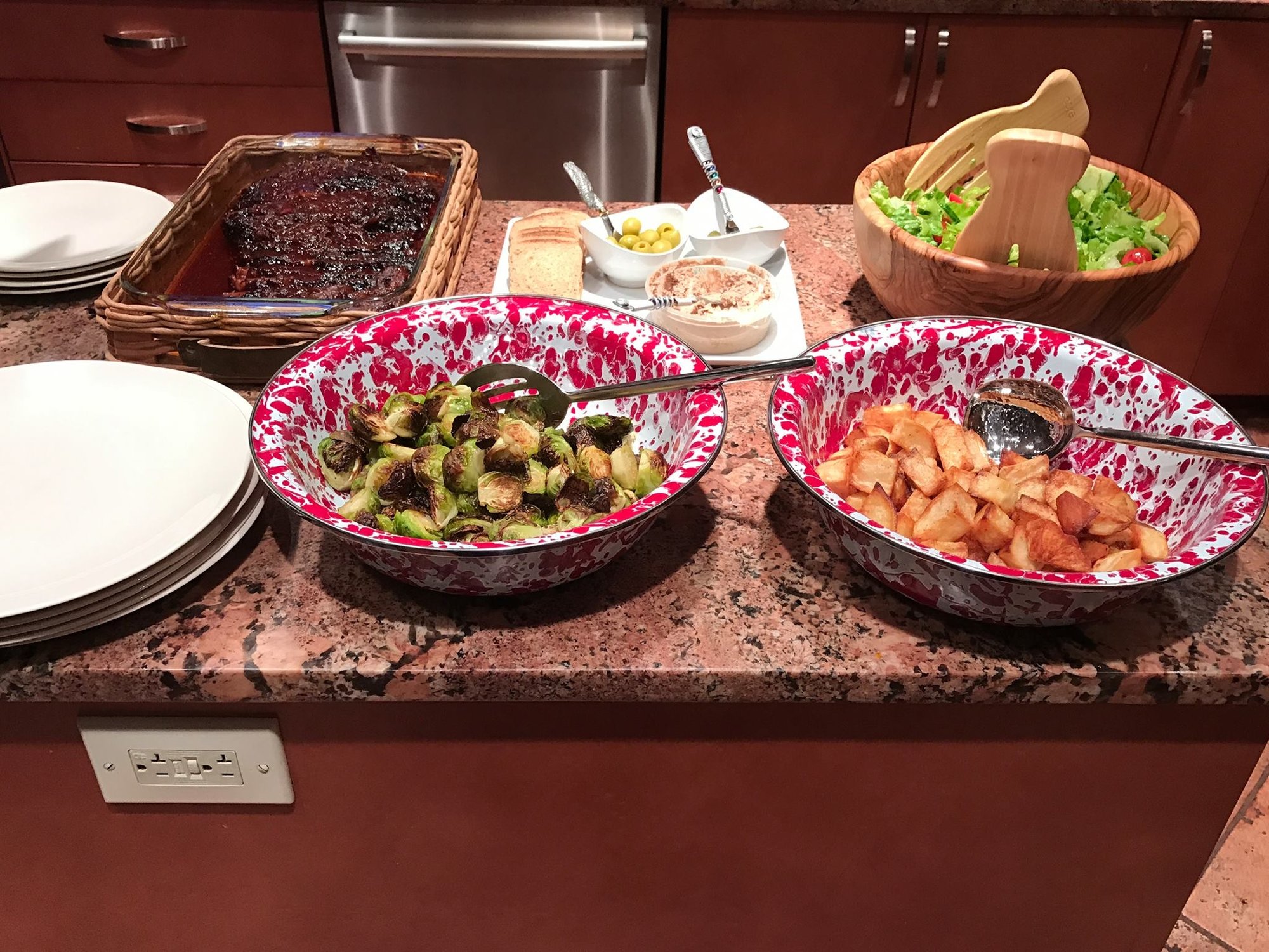 Mom's classic holiday brisket, roasted potatoes, brussel sprouts, and simple salad.