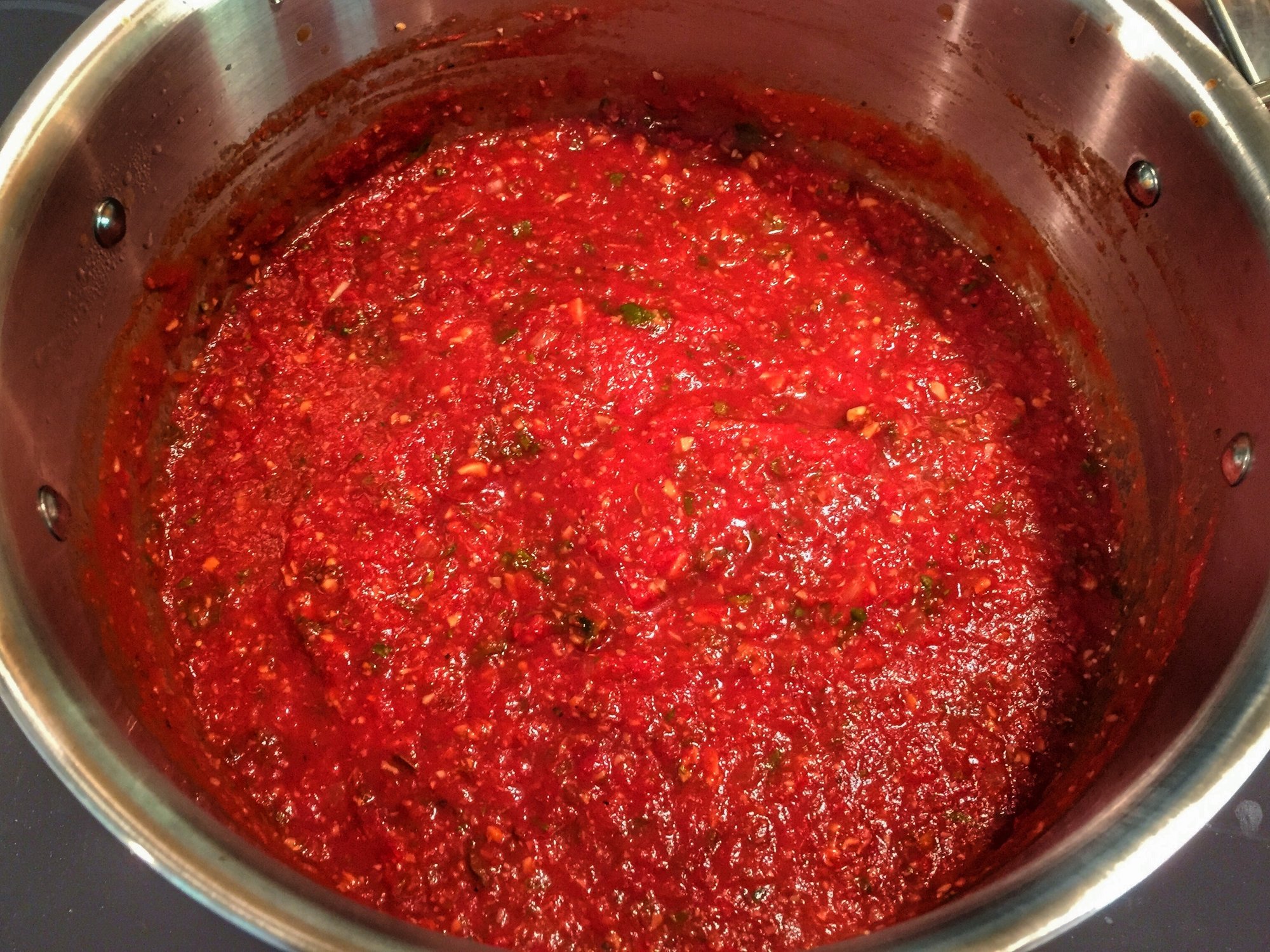 Sauce on the cooktop. 1 onion diced, 5 cloves of garlic and small box of diced shrooms all sautéed. Added 56ozs of crushed tomatoes and some fresh herbs