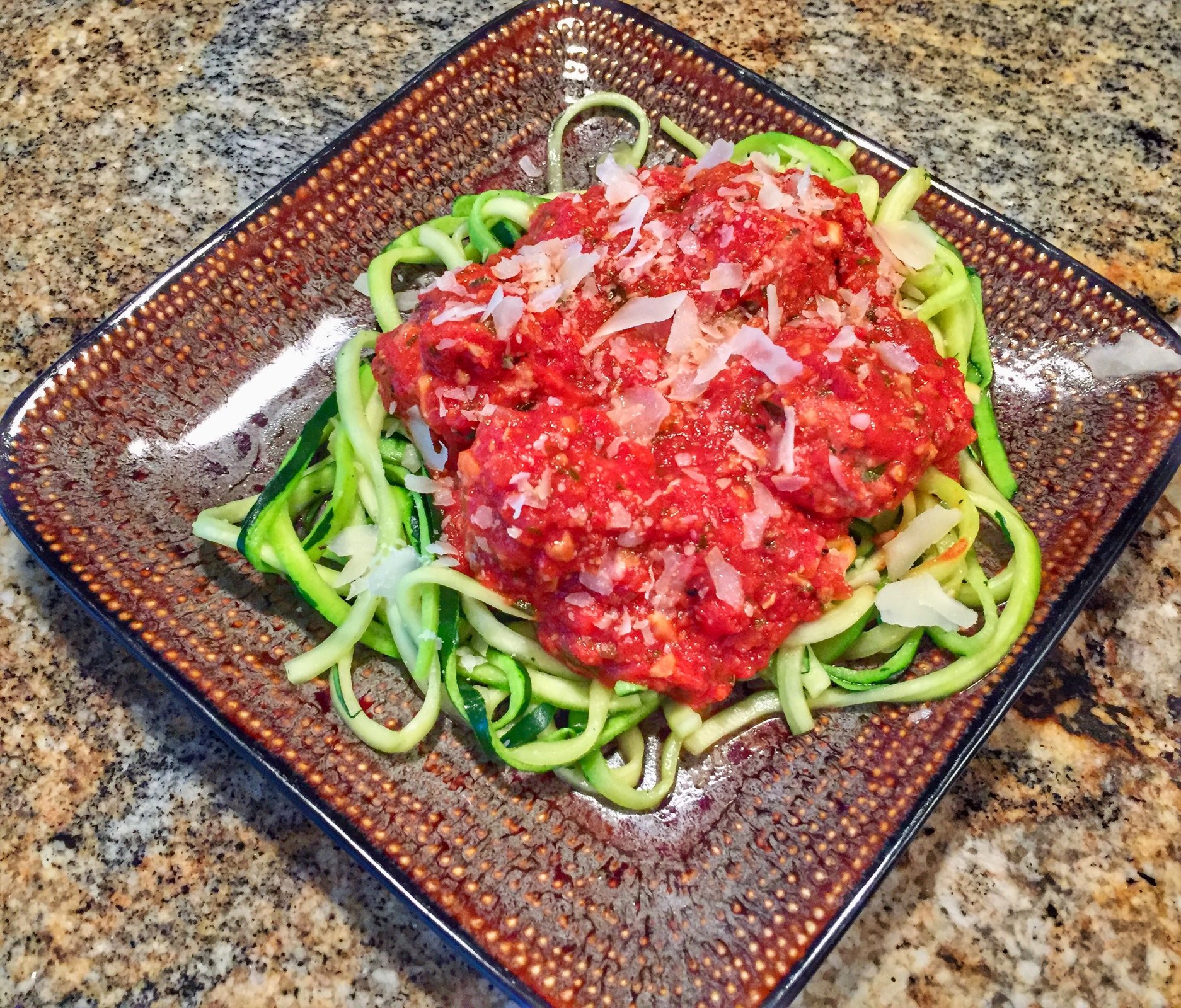 Plated up with zoodles that were stir fried in the wok on the smalll. Just realized I got no egg pics. Sorry.