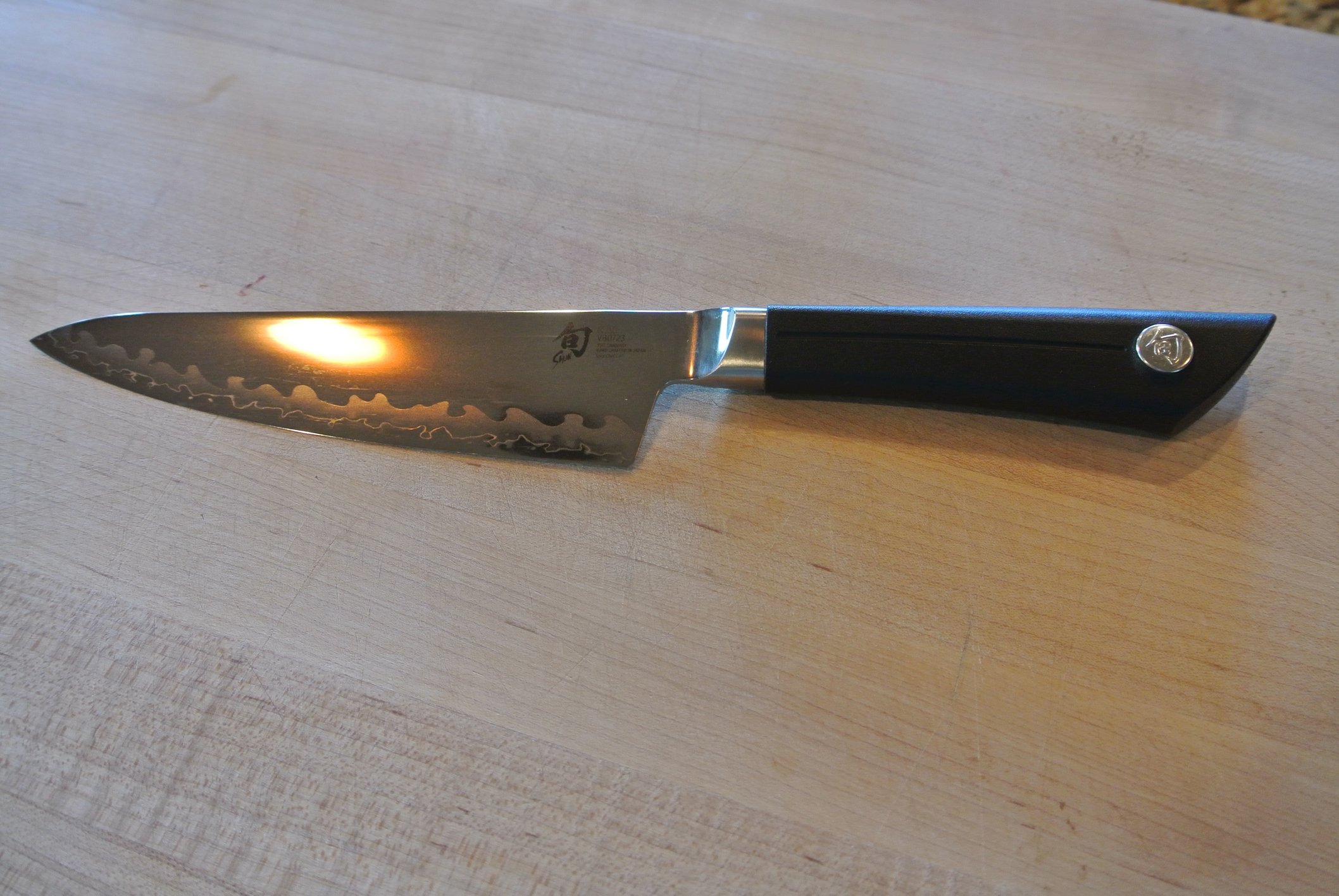 I was poking around a local store the other day and saw a 6" chefs knife from the Shun Sora line. Sora is the least expensive line of knives that Shun makes. The knife I was looking at was $50 something and change and $60 out the door I have an 8" global chefs knife that I love but wanted to try a smaller chefs knife and thought it would fit my wife's hand well. After I held this knife, it was and easy decision to buy it. At home I played with it most of the afternoon and created a dinner with as much chopping as possible. The blade is composite with a Vg10 cutting edge melded to a 420 Japanese steel upper blade. The weld is covered by the wavy pattern on the blade. The knife is razor sharp right out of the box and handles quite well. It is definetly not Shuns best knife but it certainly is a heck of a lot of knife for the money. I think of it as Shun's Victorinox, a quality knife made to come it at a reasonable price point. If your looking for reasonable priced knife you might want to add these Sora's to your list of knives to look at.