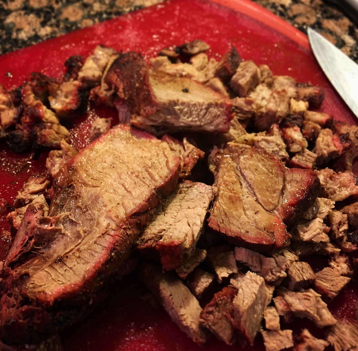 Smoked up a 3.25 lb chuckie in the Mini with rum barrel wood, pulled and diced at 190 deg f IT. Then added that and the smoky drippings to a CI DO with Jimmy Dean sausage, onions, crushed maters, diced maters, beef broth, beer, masa harina, seasonings, etc etc...