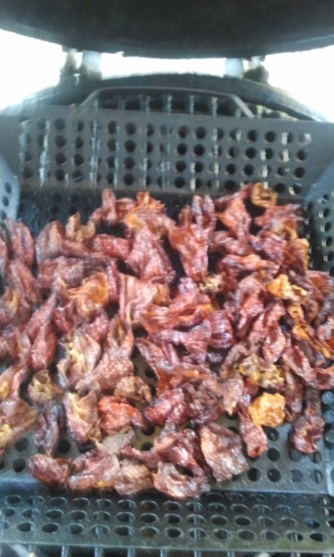 That time of the year-a load of habanero's to smoke down and grind to a powder.  Due to the moisture properties of the BGE this is quite likely a protracted event.  Goal is to stay under 200*F on the dome.  Time will tell.  But plenty of heat awaits.