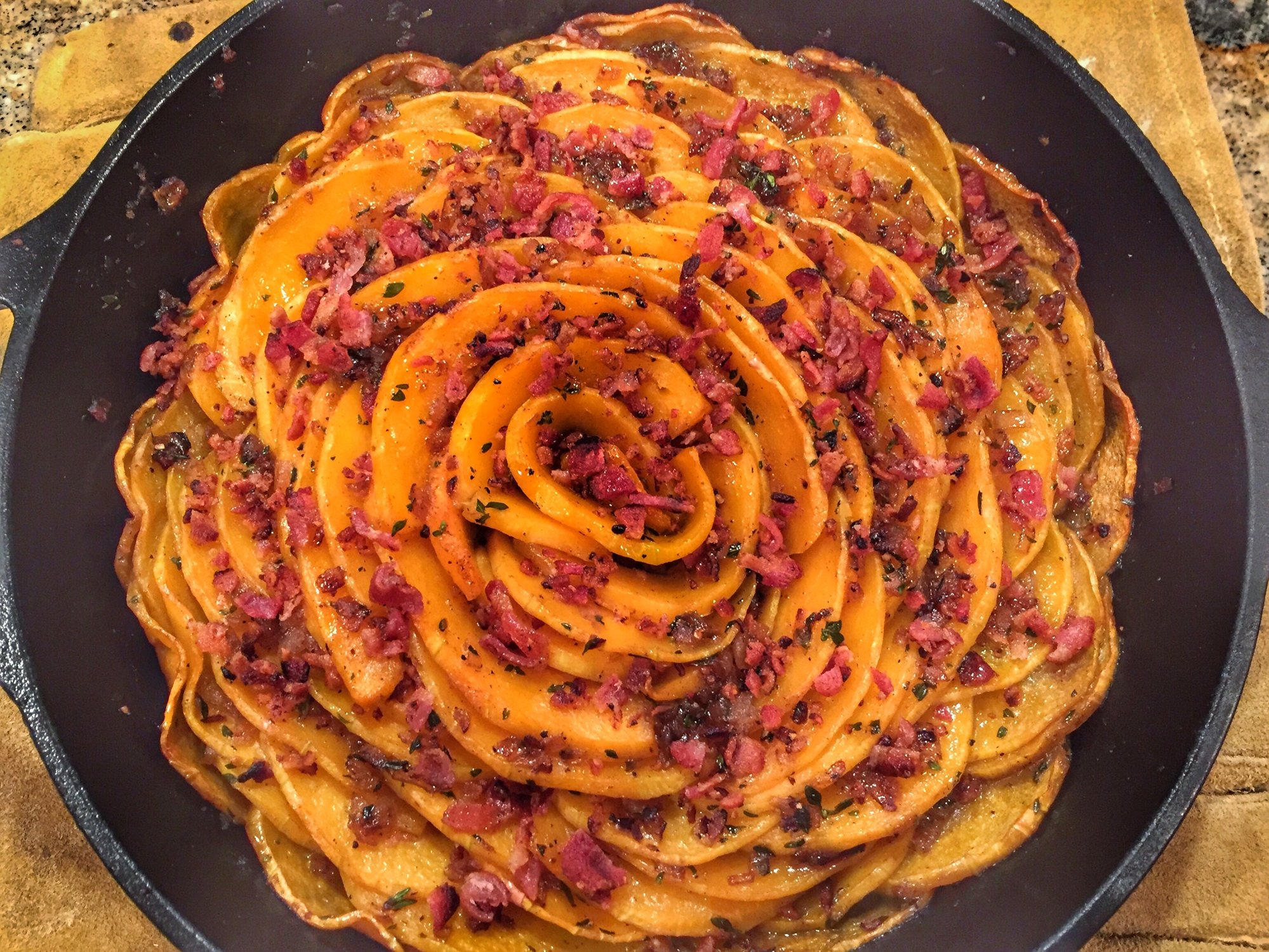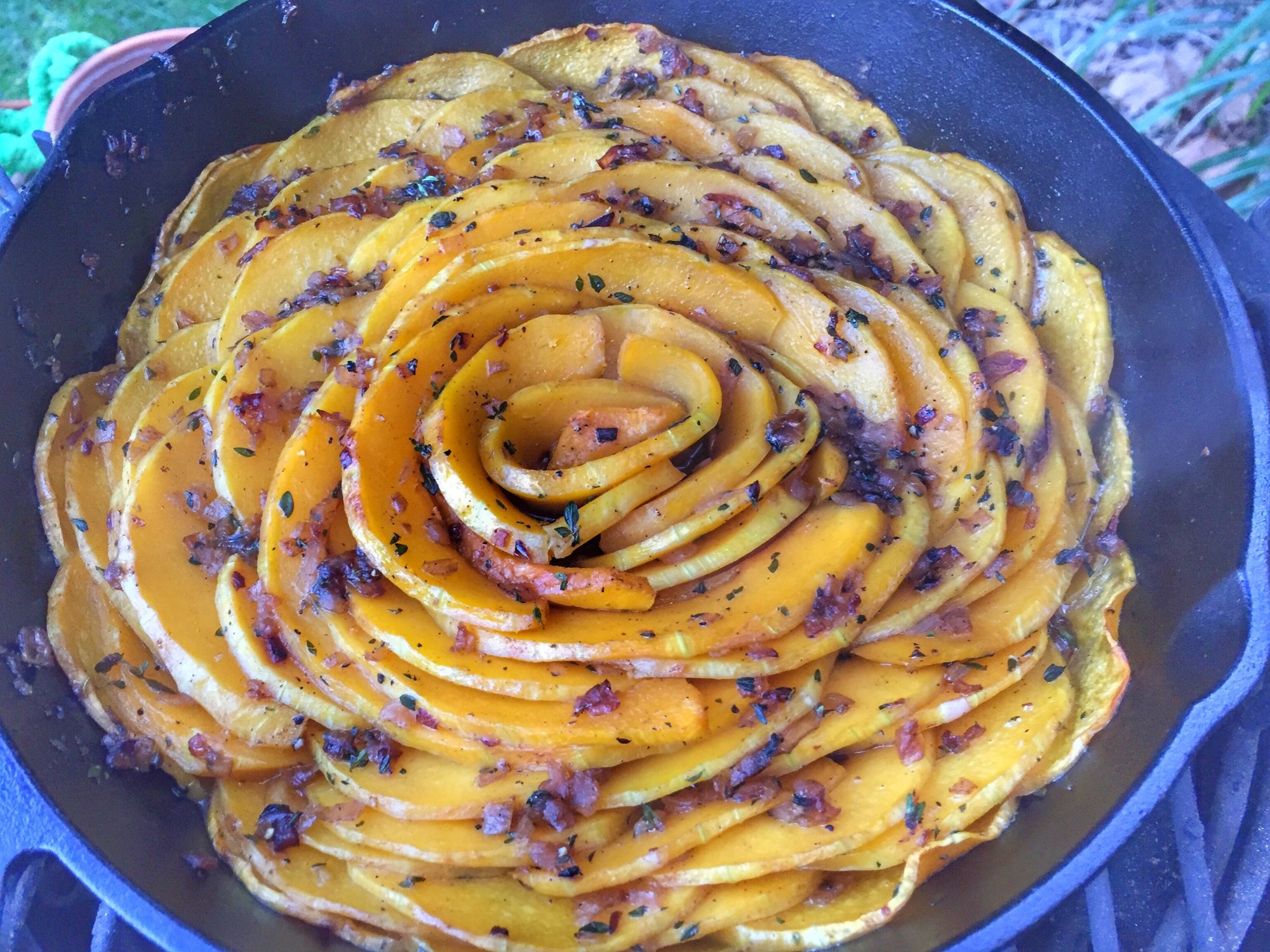 I skinned and halved a butternut squash and roasted on the small at 375 indirect for 35mins till it started to soften up.(no pics).Meanwhile I cooked 4pcs of bacon on the gasser side burner. Once I removed the bacon I sautéed some onions with some thyme,maple syrup and S&P. Then sliced the Butternut Squash,layered in the CI and drizzled the onion mixture on top. In the small at 425 for 40mins