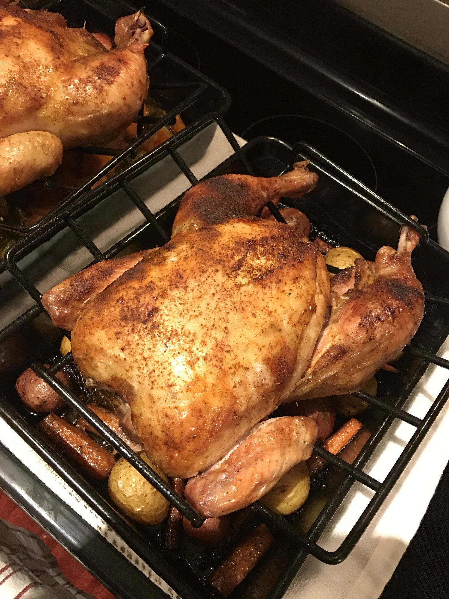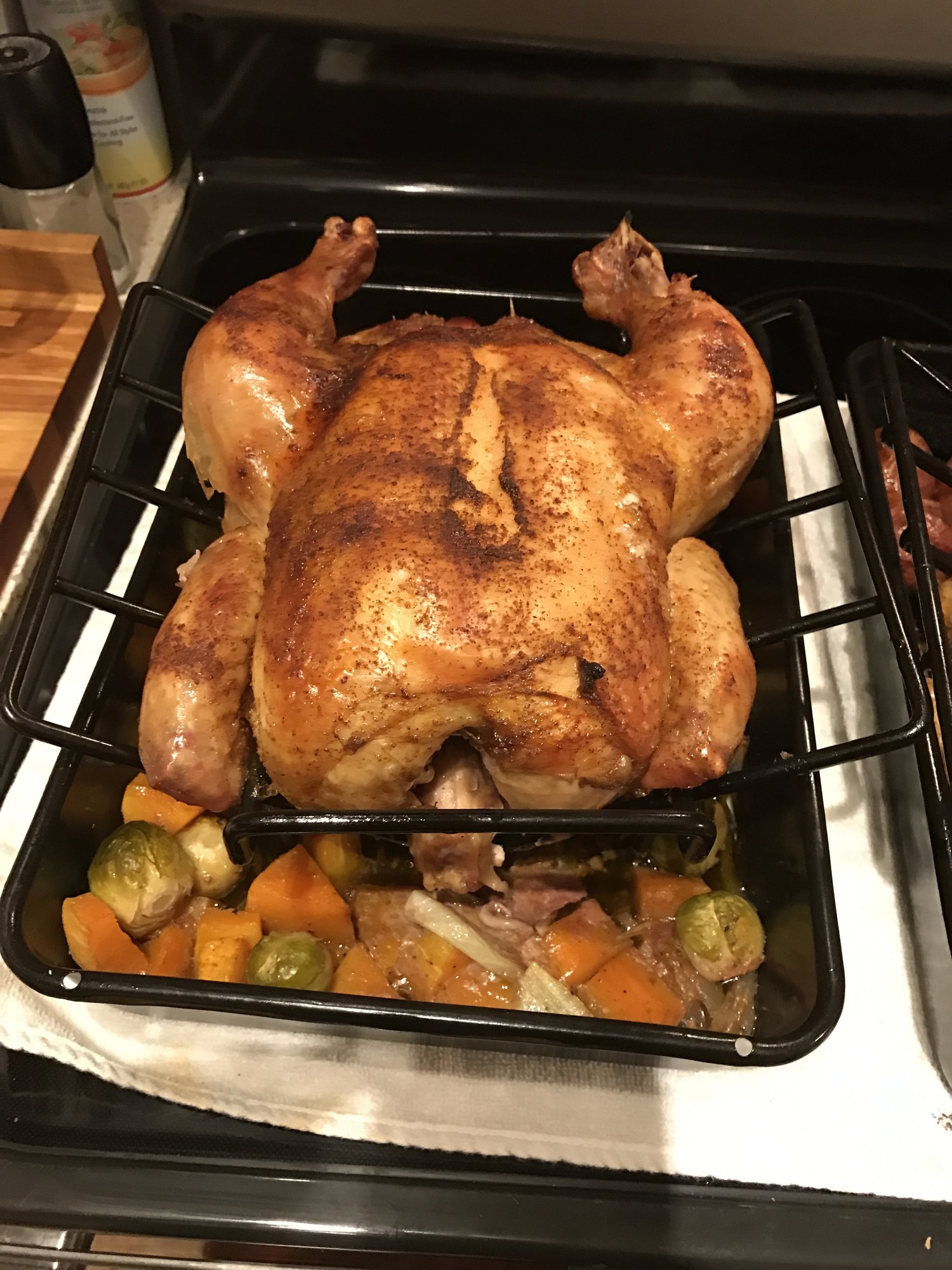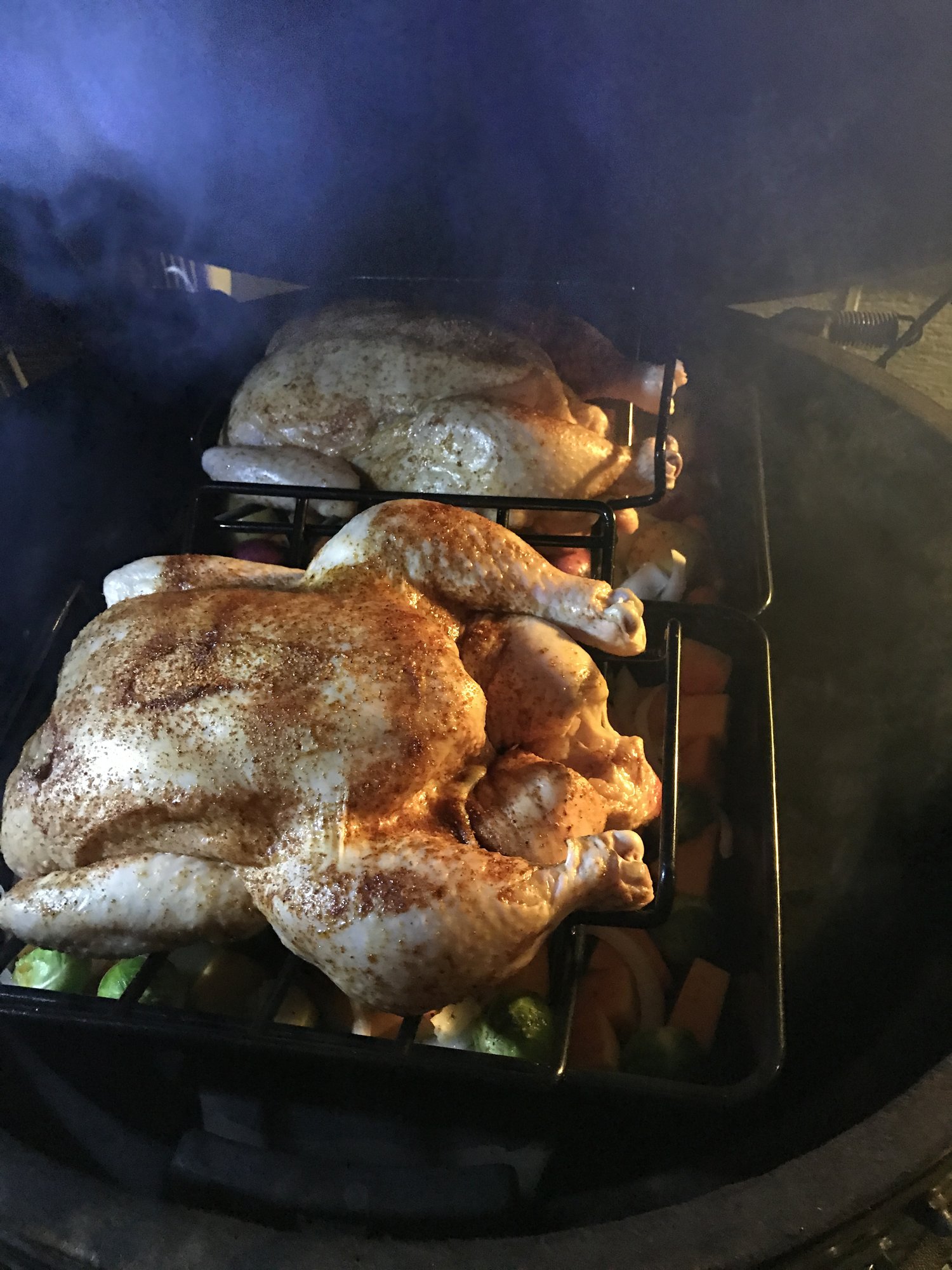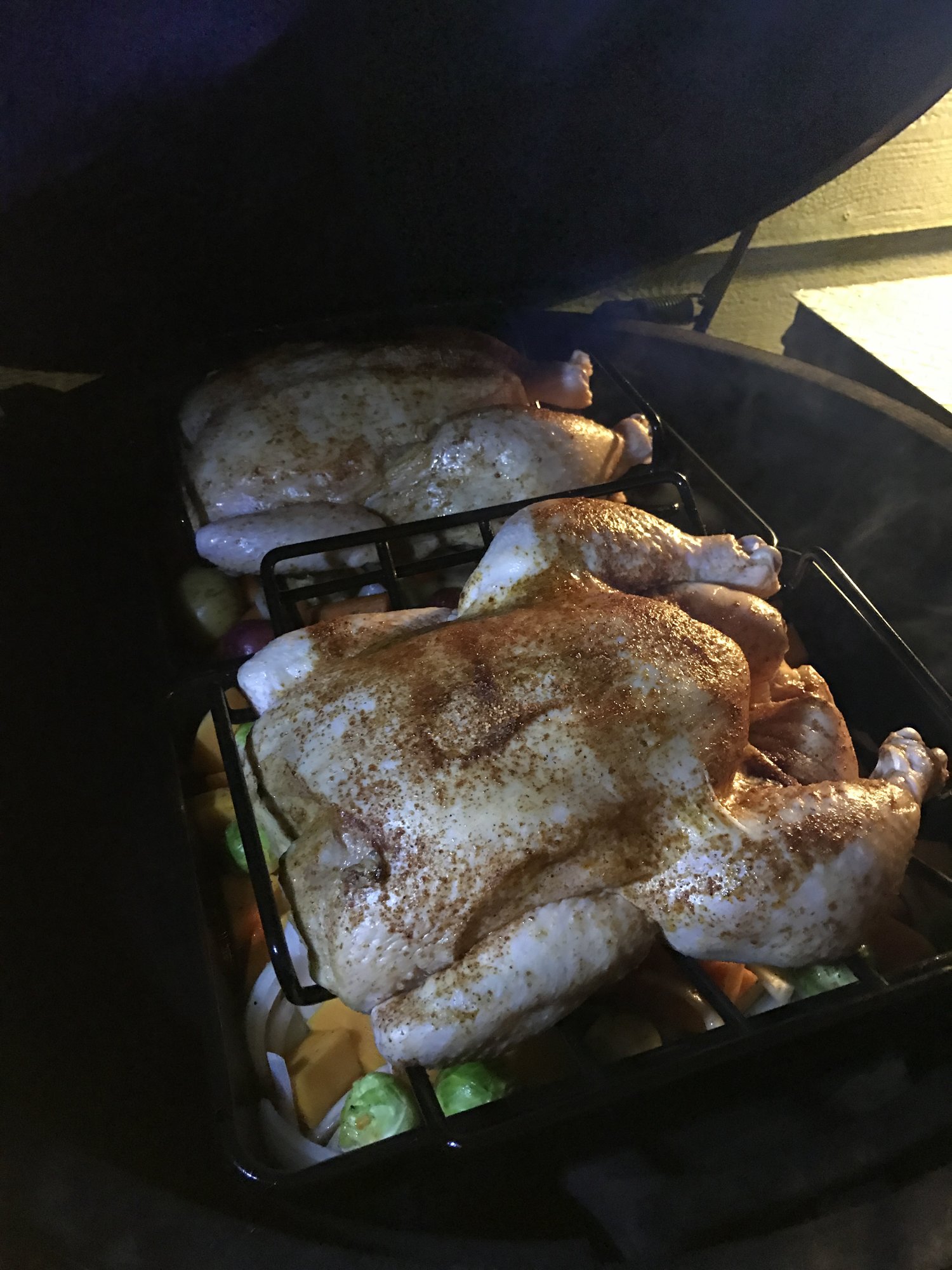 BGE V racks and roasting pans. Potatoes, carrots, onion in one, butternut squash, brussel sprouts, onion in the other.