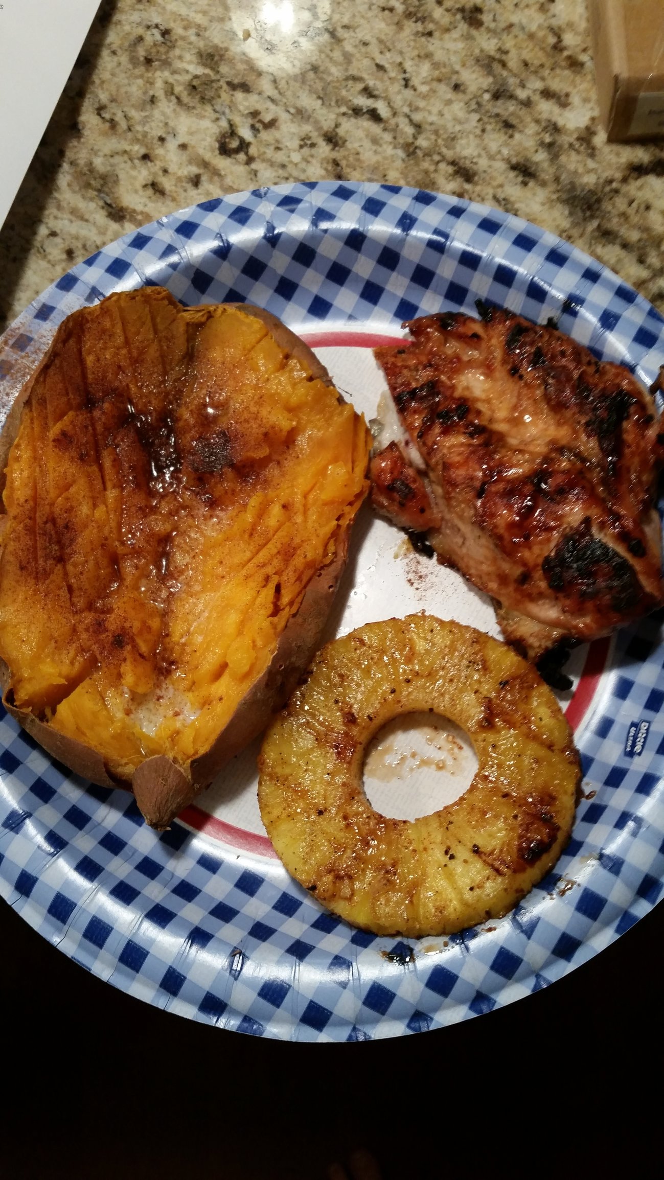 Recipe from amazing ribs, pineapple with dp pineapple head, and a sweet potato. One of my wonderful wife's favorite dinners.