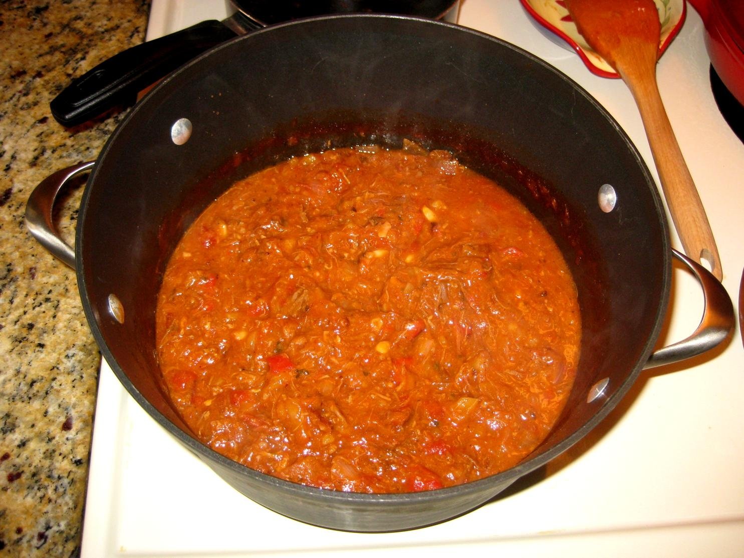 Made an incredibly tasty pot of Brunswick stew yesterday and had some for lunch today as well. This one was just a dump stew, made by dumping a bunch of stuff in the pot and simmering for a few hours time. Red onions, roasted red peppers, some grated potatoes, a little leftover corn, chopped grilled chicken, a bunch of leftover pulled pork, a large can of crushed tomatoes, some cayenne pepper, black pepper and hot sauce. Very good.