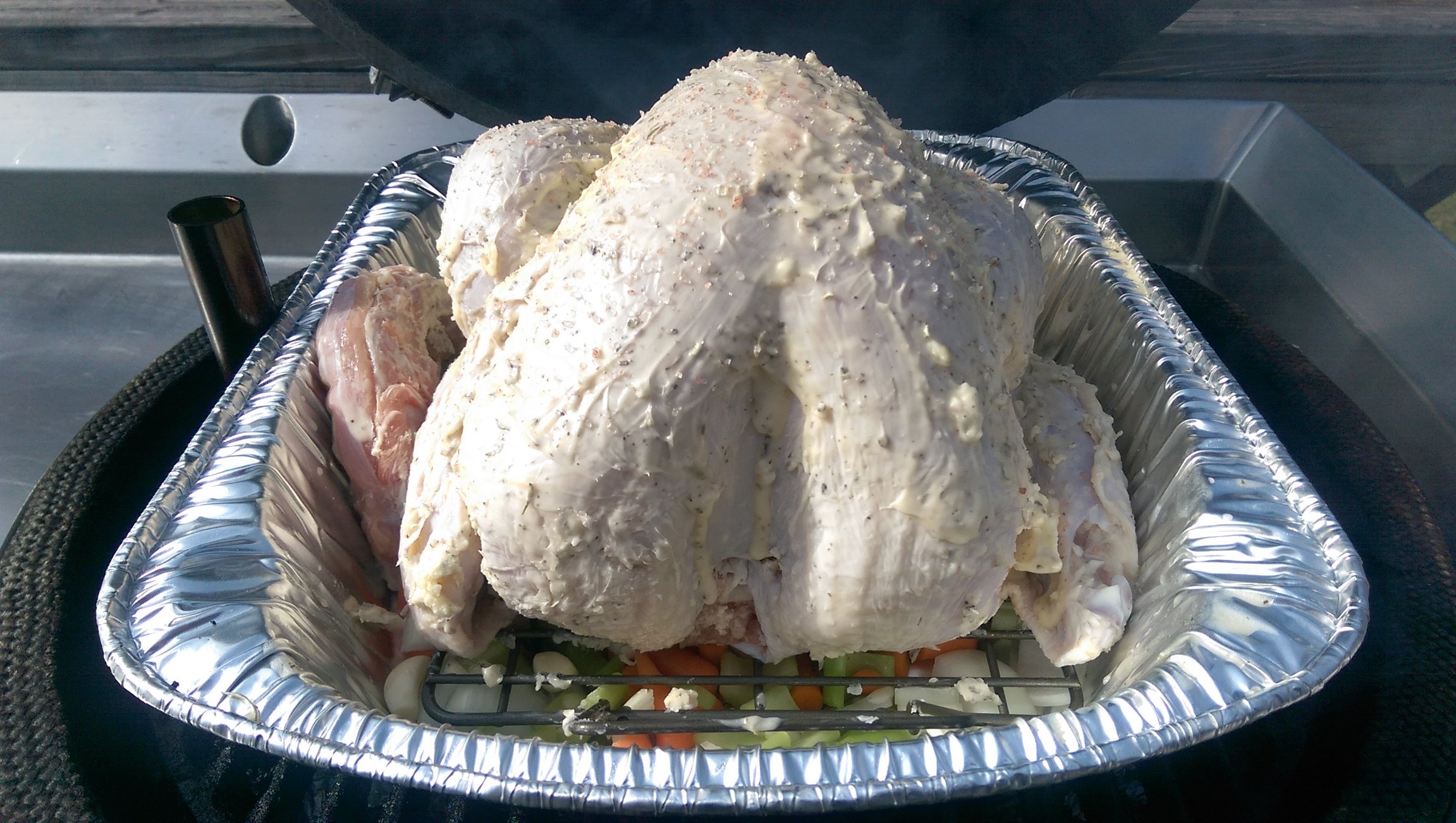 Thanksgiving Bird....no brine, fresh herb butter paste & cavity stuffed w/ a bundle of thyme, veggies below wire rack to utilize later for the gravy.  RW + black cherry & pecan @325℉ indirect.