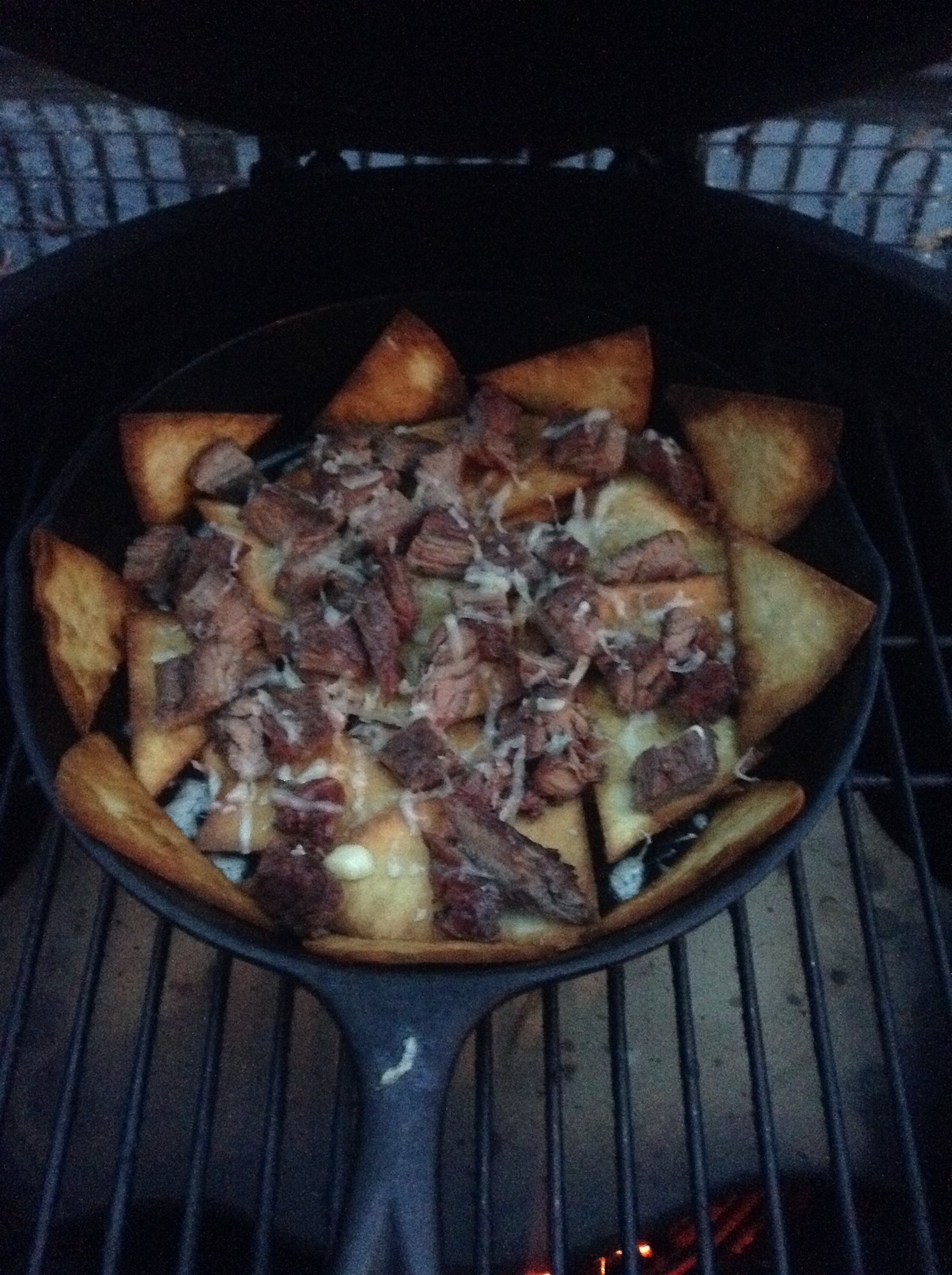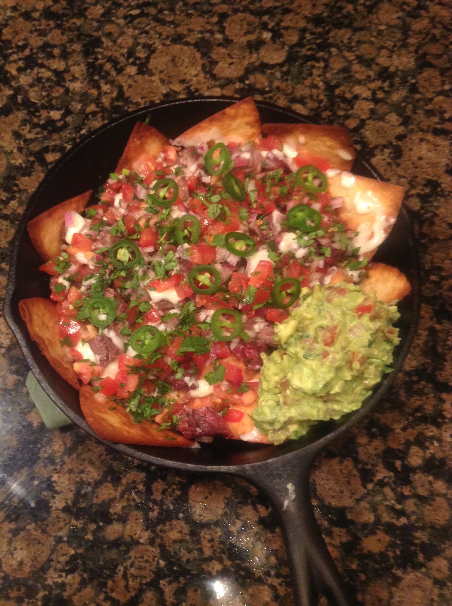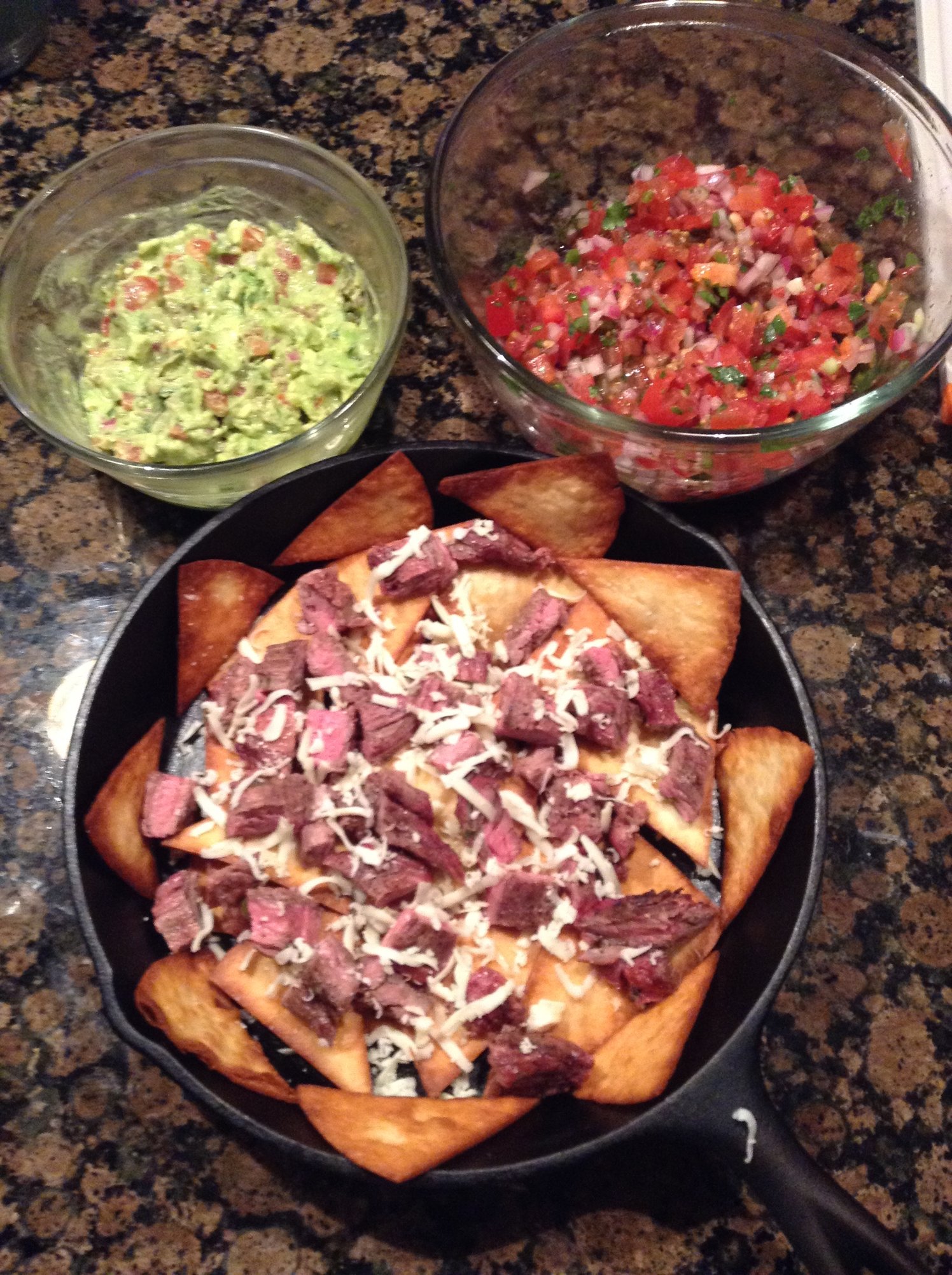 Needed some real comfort food this evening. Licking the wound and all. Marinated skirt steak, fried flour tortilla chips, scratch queso, guacamole and pico. This was amazing. Thanks for looking.