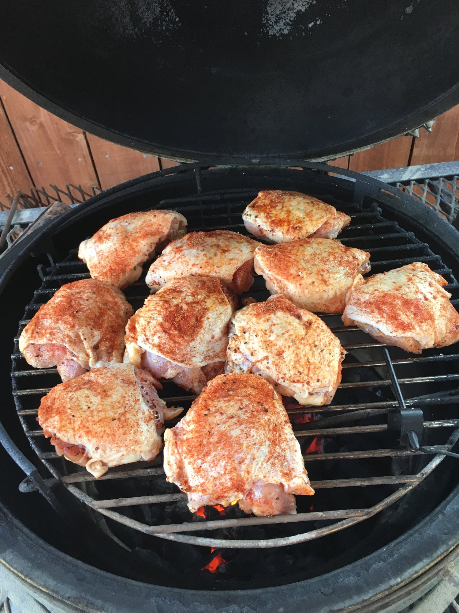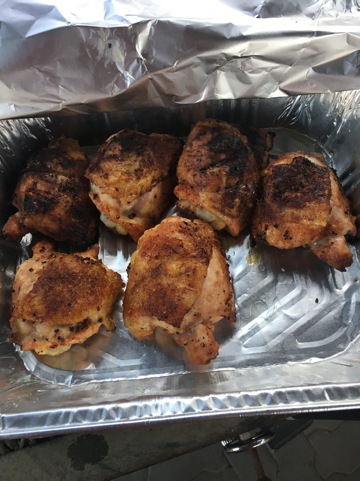 Did something different with the chicken thighs. Garlic 101 in the meat side, smoked salt, pepper and paprika under the skin and Miners Mix poultry perfection on the skin.