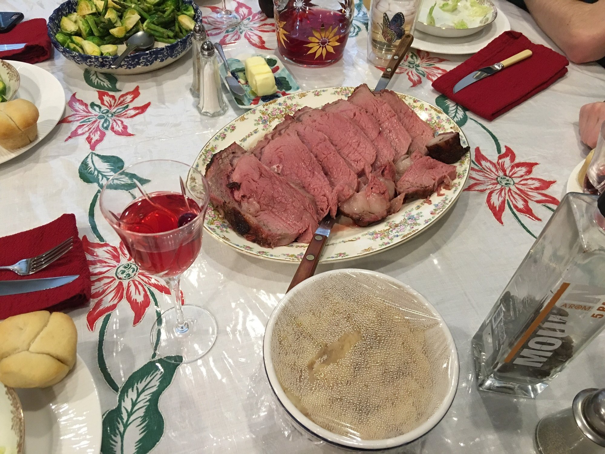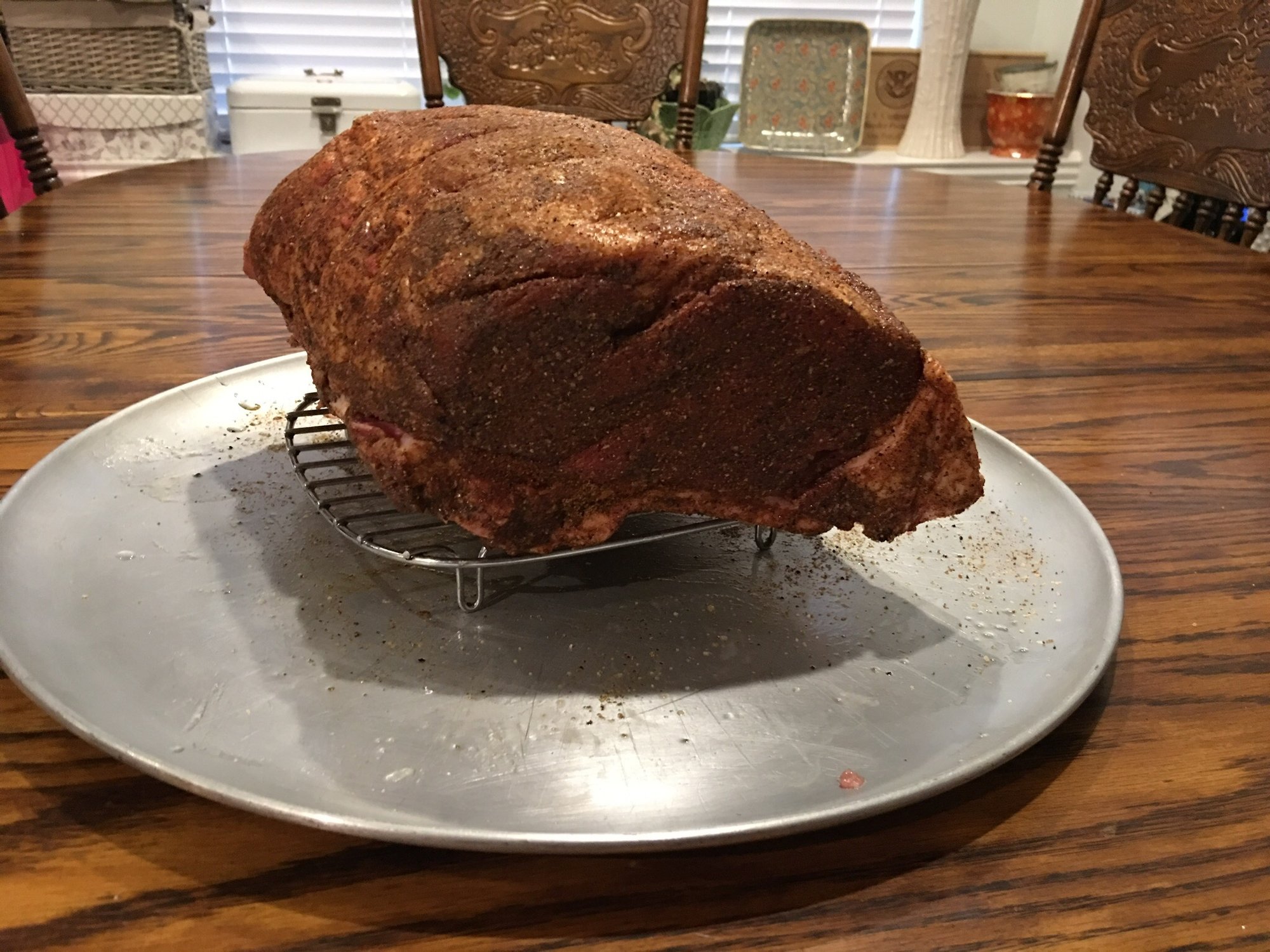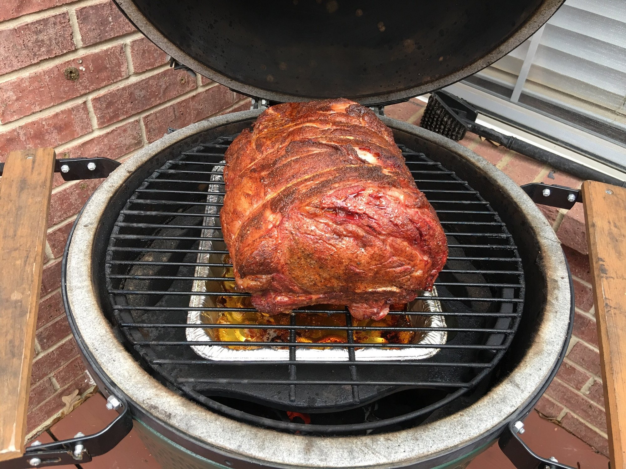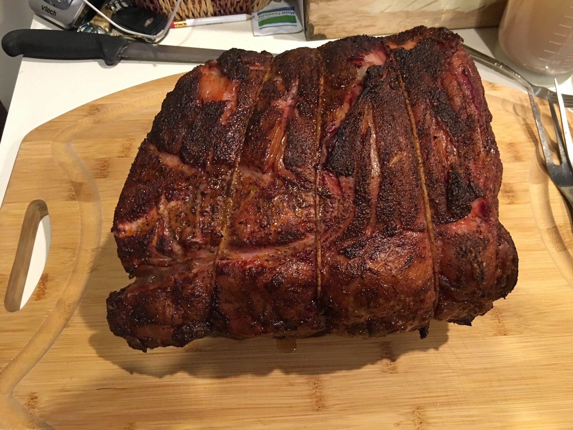 Cooked an eleven pound rib roast today on my large green egg. Used some cherry wood chips for a bit of smoke. I wanted to cook at 350 degrees but after opening gifts the temperature held at 400 degrees. Cooked to 125 internal before pulling. Came out great! Comments