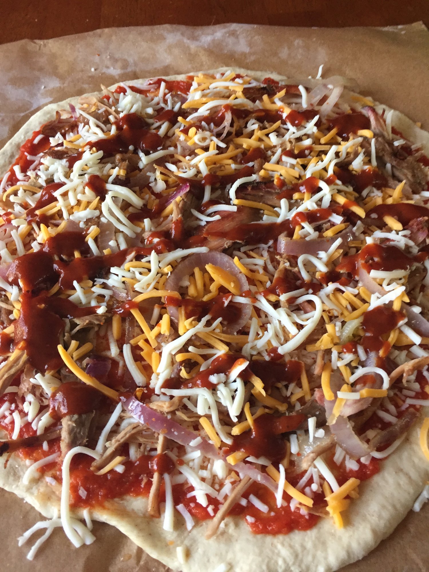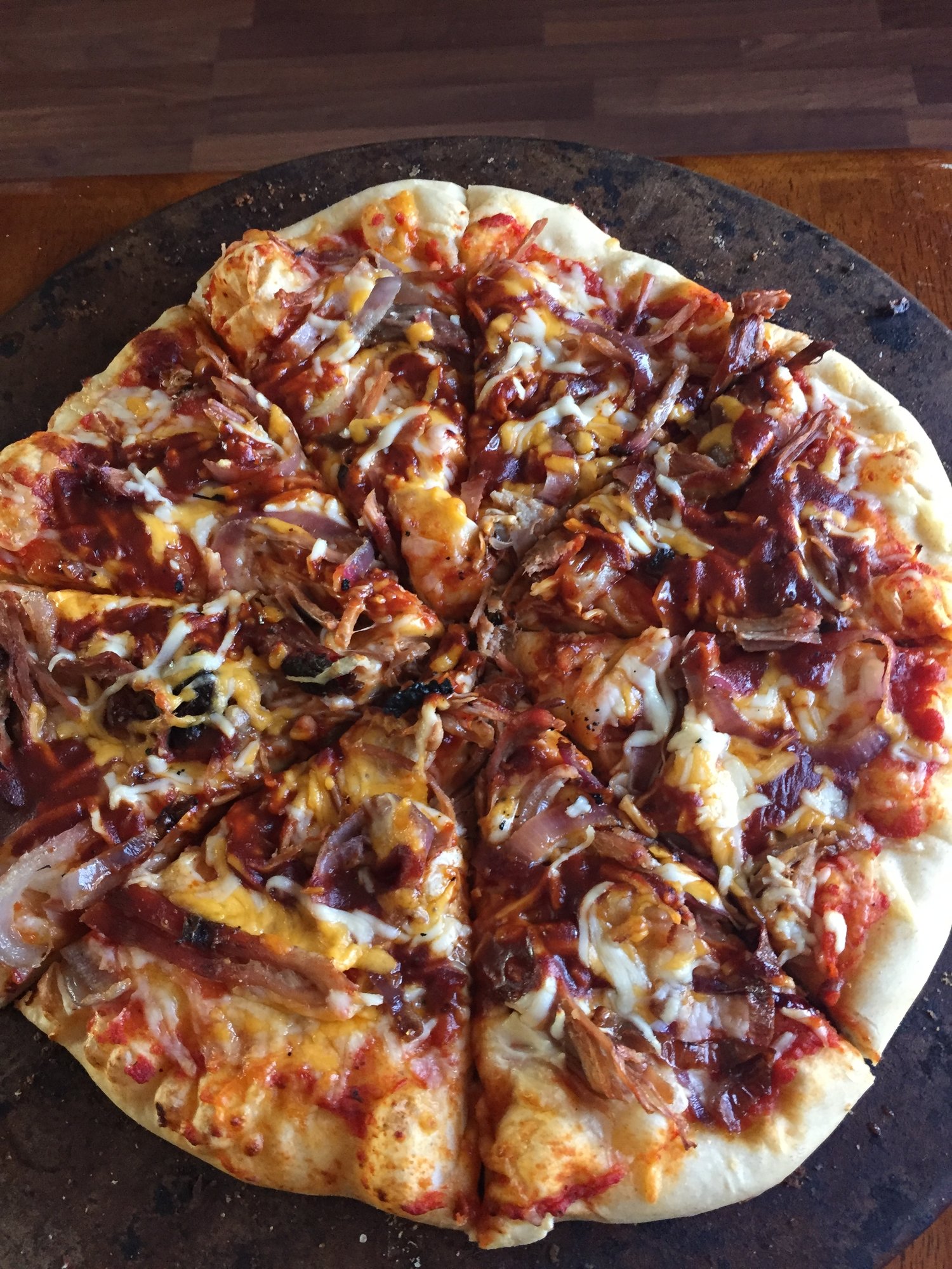 I just threw together a pulled pork and caramelized red onion pizza. It. Is. delicious.